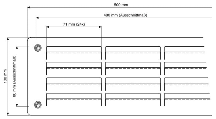 Stärke 1,5 mm · Luftdurchlass 207 cm² · nach hinten gekantete Lamellen 71 mm · Außenmaß 500 x 100 mm · Außenschnittmaß 480 x 80 mm