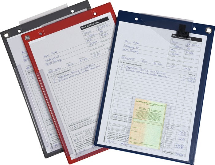 DIN A4 · robuste Ausführung vorderseitig mit Klarsichtasche und Fach für Fahrzeugschein · mit Klettverschluss und Kordel · Rückseite mit extra großer Dehnfalte für die Aufbewahrung von Serviceheften, Bordbüchern usw. VE = 10 Stück