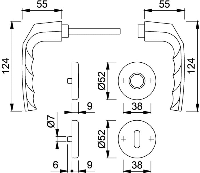 Innentür-Rosetten-Garnitur · Kunststoffunterkonstruktion mit Stütznocken · Profilstift-Verbindung · verdeckte, durchgehende Verschraubung mit selbstschneidenden Gewindeschrauben · Drückergarnitur · Anschlagrichtung DIN links / rechts