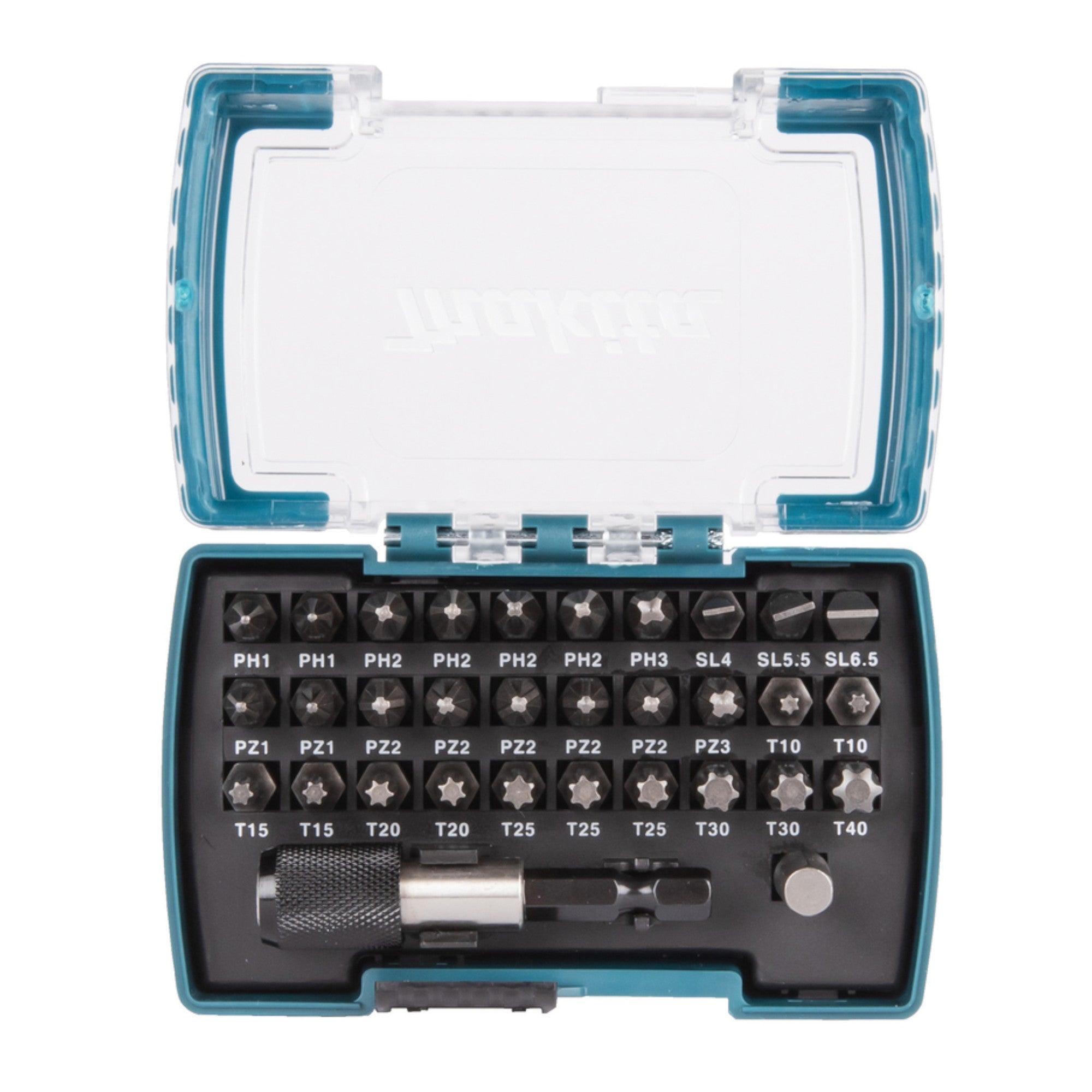 Der Makita D-74762 Bit Set umfasst 32 hochwertige Schrauberbits in verschiedenen Ausführungen und wird in einer kompakten, robusten Kunststoff-Tragebox mit transparentem Deckel geliefert. Das Set enthält neben einer umfangreichen Auswahl an Standardbits auch einen Schnellwechsel-Bithalter sowie einen 1/4"-Sechskant-Stecknussadapter, die ein zügiges und effizientes Arbeiten ermöglichen.