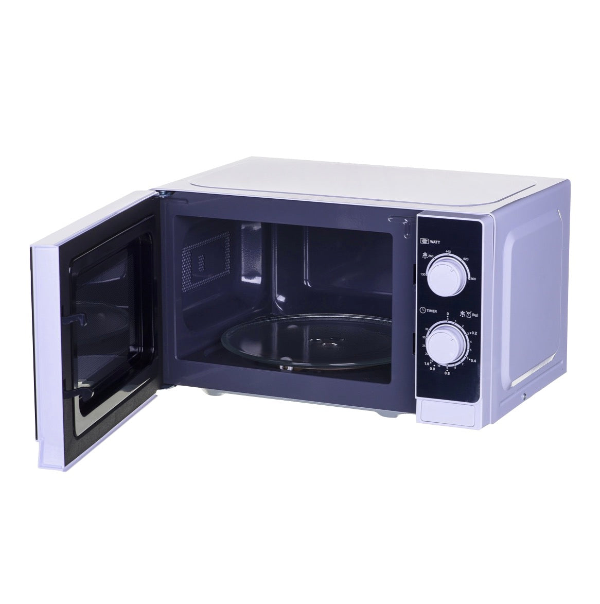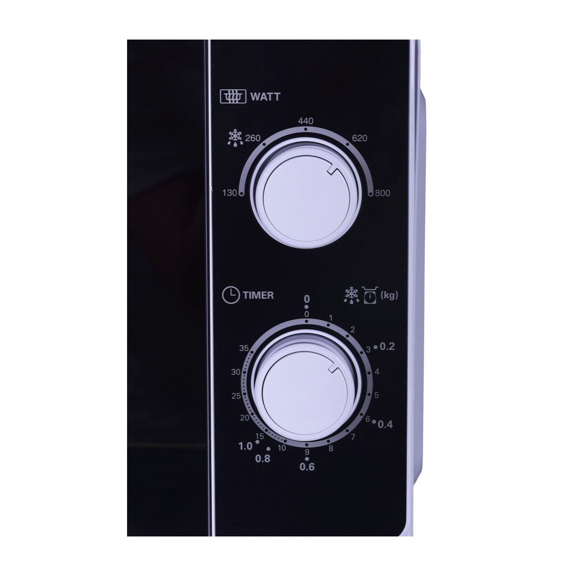 Die Firma Sharp bietet hier mit der R200WW eine 800 W starke Mikrowelle mit 5 verschiedenen Stufen zum Auftauen, Erwärmen oder Erhitzen und einen 20 Liter großen Garraum. Die Garzeit lässt sich bis zu 35 Minuten einstellen, somit lassen sich beispielsweise Speisen langsam und schonend auftauen. Der 25,5 cm große Glasdrehteller bietet genug Platz um seine Speisen zu platzieren. Durch den lackierten Innenraum lässt isch die Mikrowelle einfach reinigen. durch den Druckknopf unterhalb des Timers lässt sich die Tür problemlos öffnen.