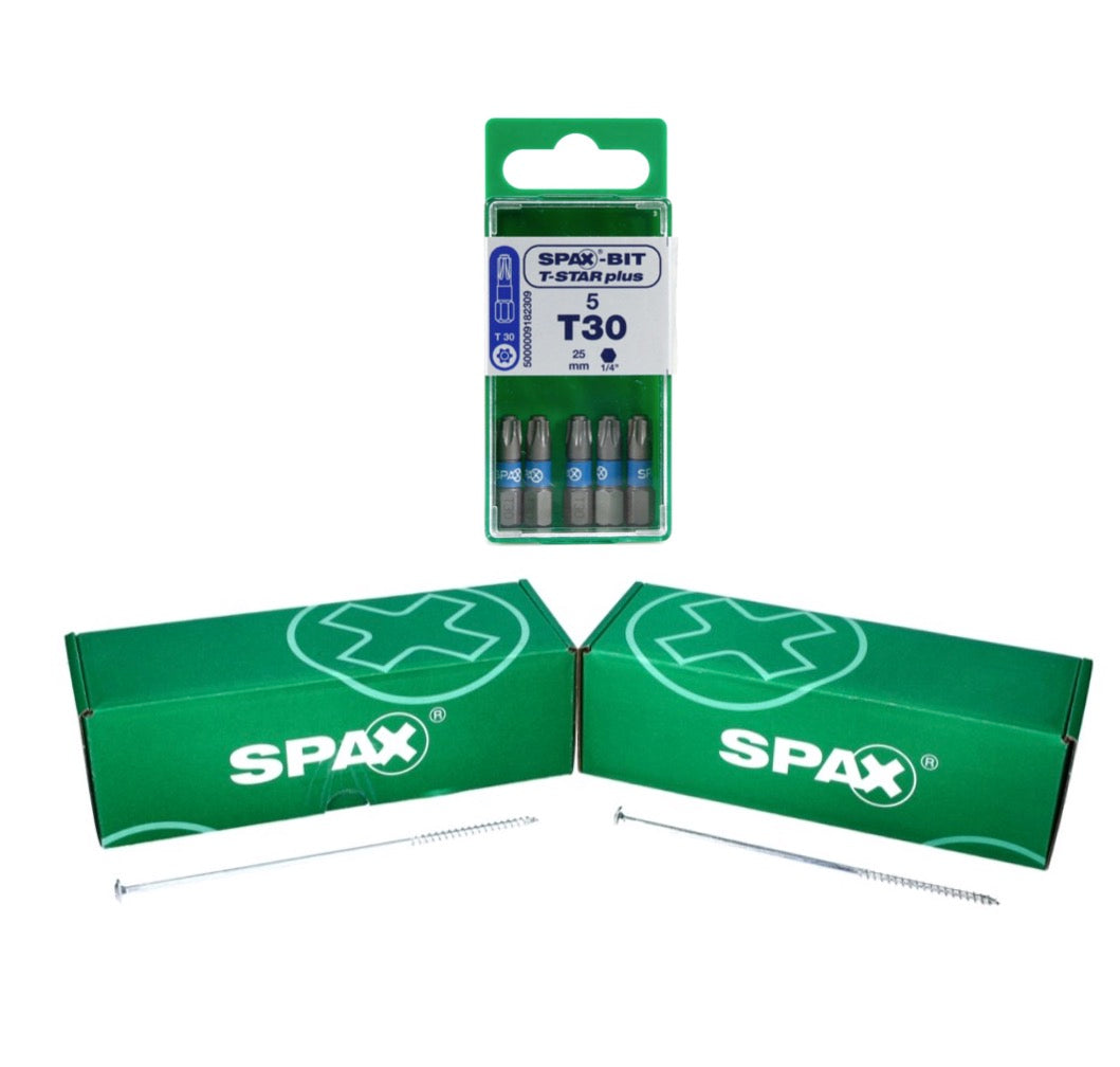 SPAX Set BIT T-STAR plus T30 - 6,4 x 25 mm, 5 Stk. ( 5000009182309 ) + HI.FORCE Tellerkopf Schraube 6,0 x 60 mm 200 Stk. ( 0251010600605 )