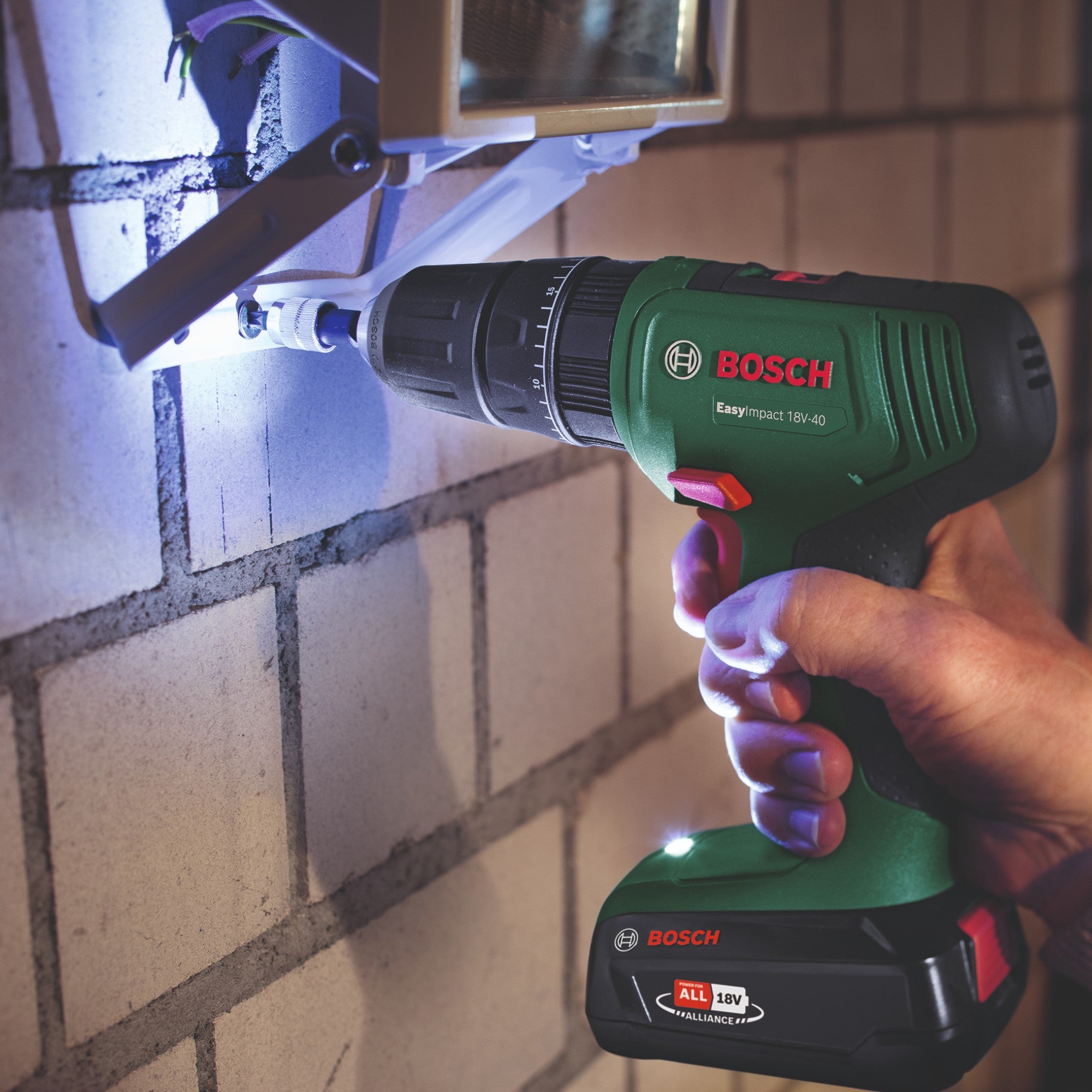 Bosch EasyImpact 18V-40 ist eine vielseitige Akku Schlagbohrschrauber zum Schrauben, Bohren in Holz, Metall und Kunststoff sowie zum Schlagbohren in Mauerwerk. Das 2-Gang-Getriebe und 20 Drehmomentstufen sorgen für die passende Leistung und Drehzahl in jeder Anwendung. Das einhülsige 13-mm-Schnellspannbohrfutter ermöglicht einen einfachen Wechsel von Bohrern und Schrauberbits. Dank schlankem, ergonomischem Design und integriertem LED-Licht ist ein komfortables Arbeiten auch in schlecht beleuchteten Bereichen möglich. Das Gerät ist Teil der 18V POWER FOR ALL ALLIANCE, sodass ein Akku in vielen Geräten verschiedener Marken eingesetzt werden kann.