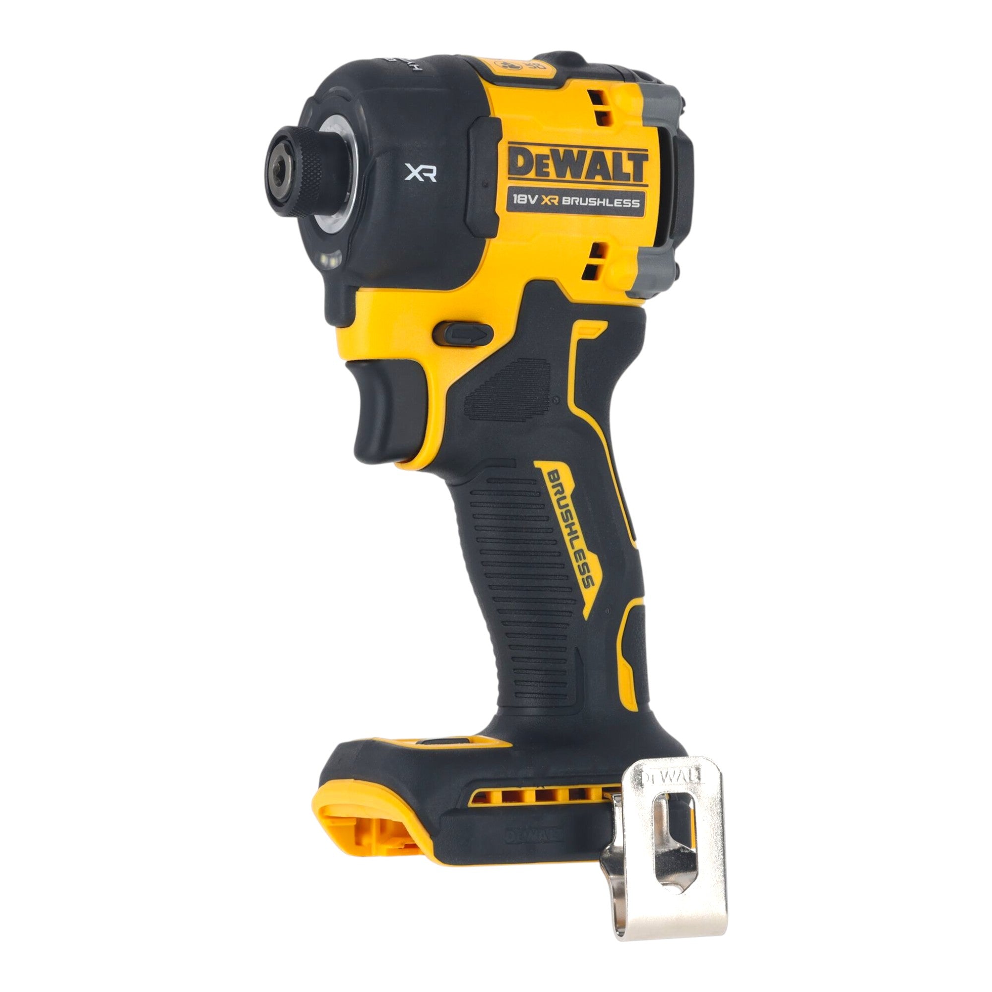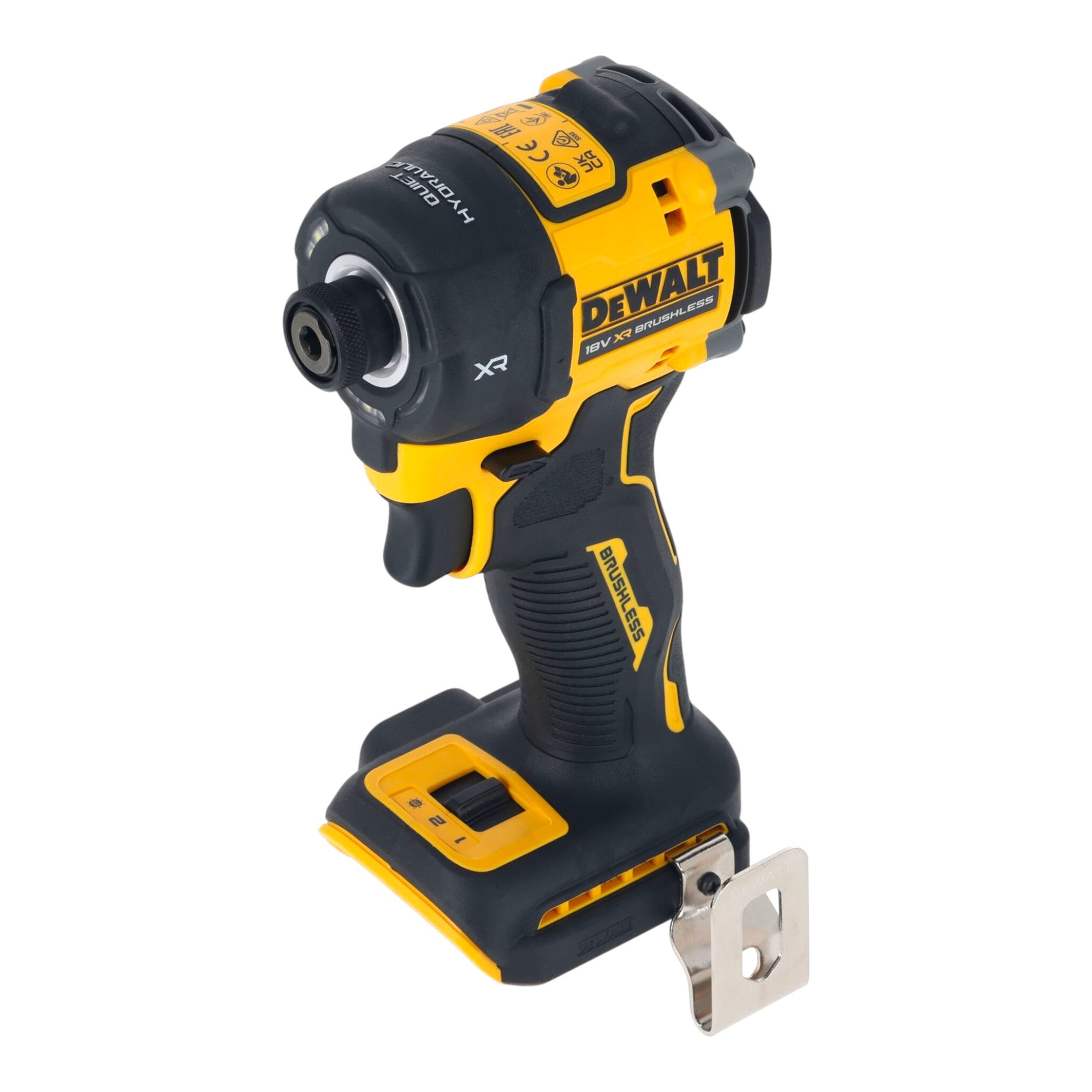 The DeWalt DCF 870 cordless impact wrench impresses with its innovative hydraulic motor, which ensures a longer service life, greater efficiency and more power. Thanks to the brushless motor technology, the tool offers an extended runtime per battery charge and also works particularly quietly - up to 44 % more quietly than the DCF850 at the same speed. With a maximum torque of 56 Nm, the impact wrench delivers powerful performance for precise screwing and loosening of connections, while the speed and impact rate can be individually adjusted via two electronic stages. The robust, magnetic ¼" hexagon socket with self-locking and drop-out function enables bits to be changed quickly and safely. Thanks to its extremely compact design with an overall length of just 101 mm and the ergonomic rubberised handle, the tool fits perfectly in the hand and can also be used in confined spaces without any problems. An integrated 9-LED light with up to 82 lumens ensures optimum visibility and also offers a 20-minute torch mode. The metal belt hook and magnetic bit holder increase ease of use and practicality. Compatible with all 18V Li-Ion XR and XR Flexvolt batteries, the DCF 870 combines power, precision and efficiency in a particularly quiet, compact and durable impact wrench - supplied as standard in the practical T STAK box.