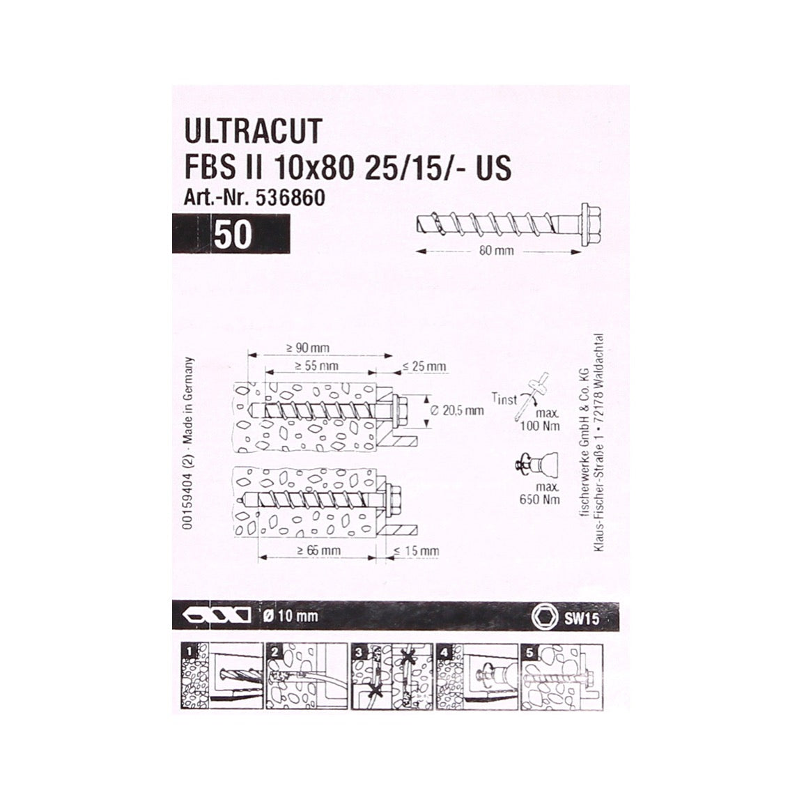 Fischer tornillos para hormigón ULTRACUT FBS II 10x80mm 25/15/- 100 piezas cabeza hexagonal SW15 (2x 536860)