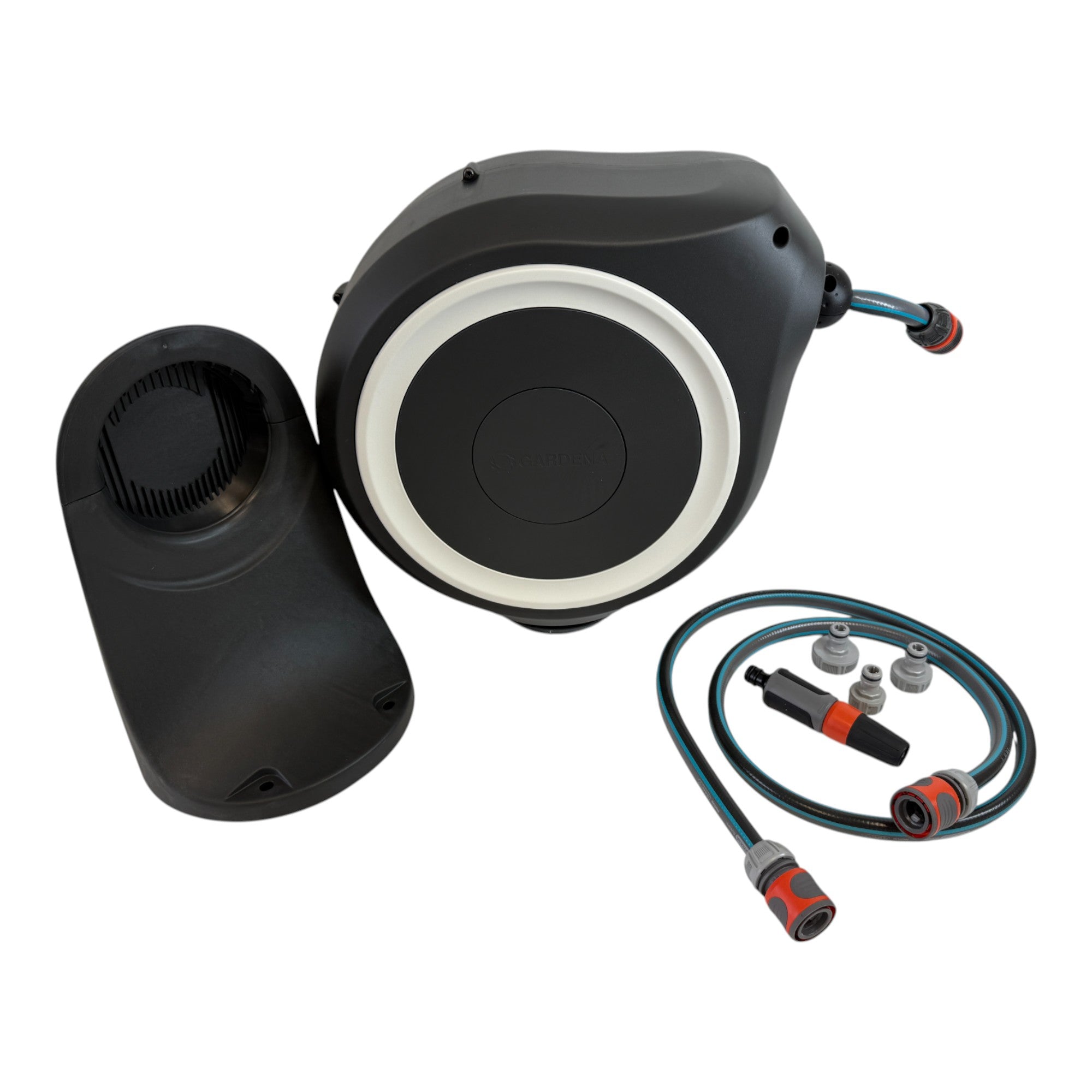 With the GARDENA Wall Hose Box RollUp S, watering your garden becomes child's play: The compact box can be permanently mounted on the house wall and is equipped with a 15 metre long hose, which offers you maximum freedom of movement when watering thanks to the 180° swivel design - without any annoying twisting, kinking or knotting. When you pull the hose to the desired length, short locking stops automatically engage and secure it reliably in place. A light pull is all it takes for the integrated steel spring to retract the hose evenly, safely and without uncontrolled recoiling thanks to RollControl technology. The precise hose guide ensures that the hose is rolled up neatly without kinks. Thanks to the tried and tested Original GARDENA System, all GARDENA Watering Attachments can be flexibly connected - and even stored under the wall bracket to save space. The UV and frost-protected design makes the RollUp XL weatherproof all year round, while theft protection offers additional security. All the necessary installation and connection parts are included, including a connecting hose, wall bracket, system parts and a sprayer with two spray options - for an all-round well thought-out watering experience.
