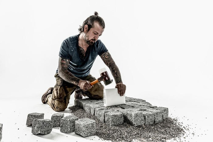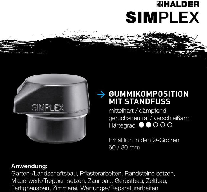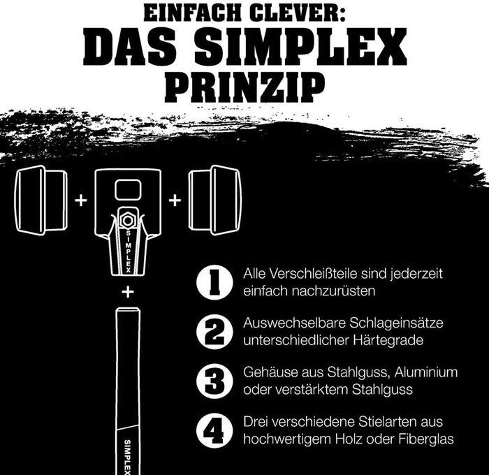 2-part clamping housing made of malleable cast iron - impact inserts and Simplex handle can be easily replaced by loosening or tightening the hexagon socket clamping screw - impact heads are non-abrasive - with 1 piece each of rubber compound, black, with base (medium hard) and rubber compound, black (medium hard) - low-wear