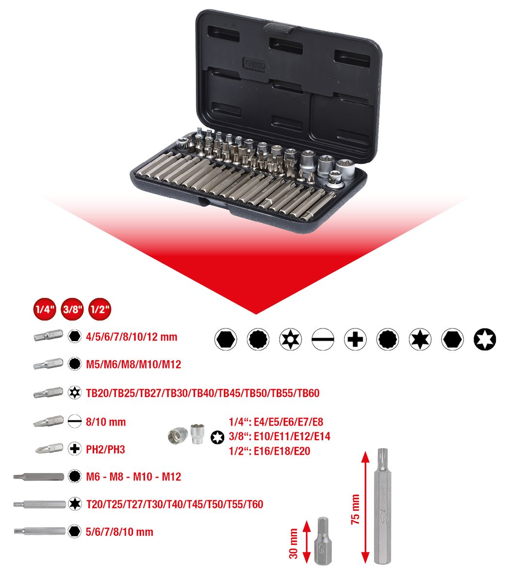 KS TOOLS 1/4'+3/8'+1/2' Juego de llaves de vaso y puntas Torx, 57 pzs ( 911.4305 )