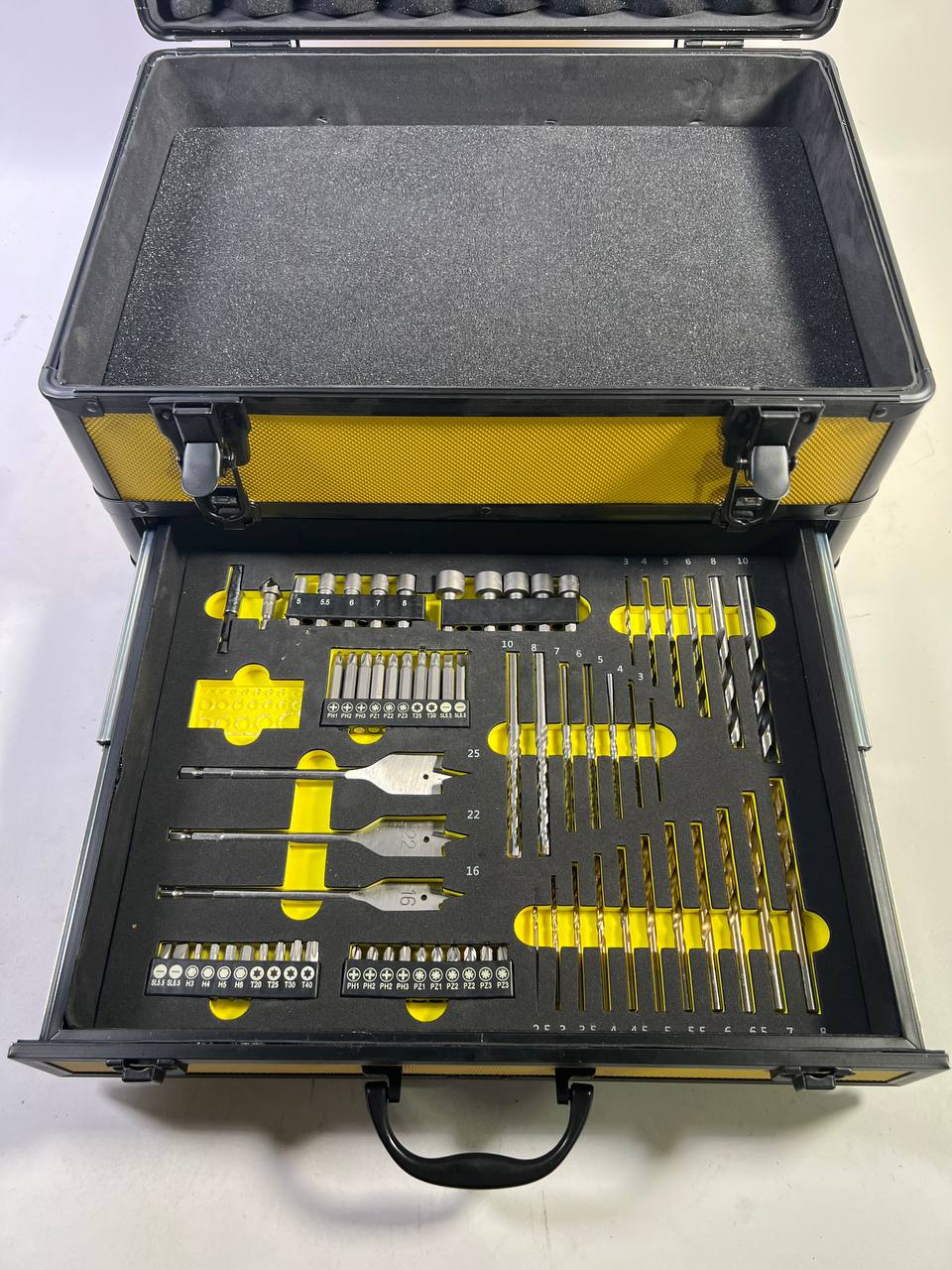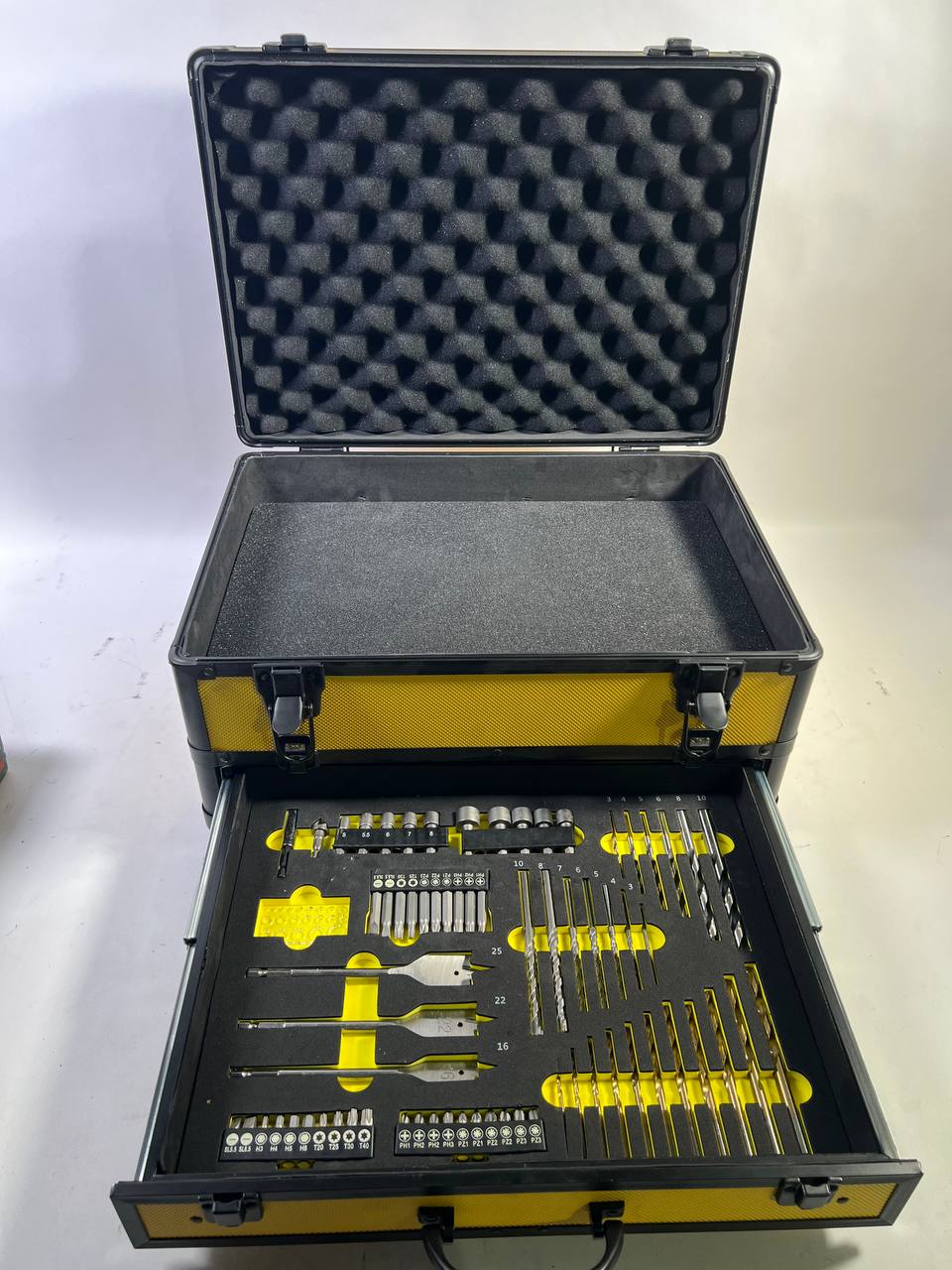 El maletín de herramientas de aluminio Toolbrothers TX, con su inserto de espuma cúbica adaptable universalmente, ofrece espacio suficiente para una máquina (p. ej. llave de impacto), cargador y hasta dos baterías. El juego de brocas y taladros de 70 piezas del cajón cubre todas las aplicaciones. Las brocas, avellanadores, llaves de vaso y taladros están disponibles en una amplia gama de variantes. Ya sea madera, metal o piedra, el maletín contiene una gran variedad de brocas en los tamaños más habituales. El buen acabado del maletín promete una larga vida útil y además es muy agradable a la vista. El asa de transporte de goma es suave para las palmas de las manos y puede utilizarse también con guantes. Los cierres metálicos del maletín son robustos y duraderos. Los insertos en la base y la tapa garantizan que las máquinas se transporten de forma segura dentro de la maleta. Con el maletín de aluminio TX, tendrá las herramientas de trabajo y los accesorios correspondientes guardados de forma segura en un maletín.