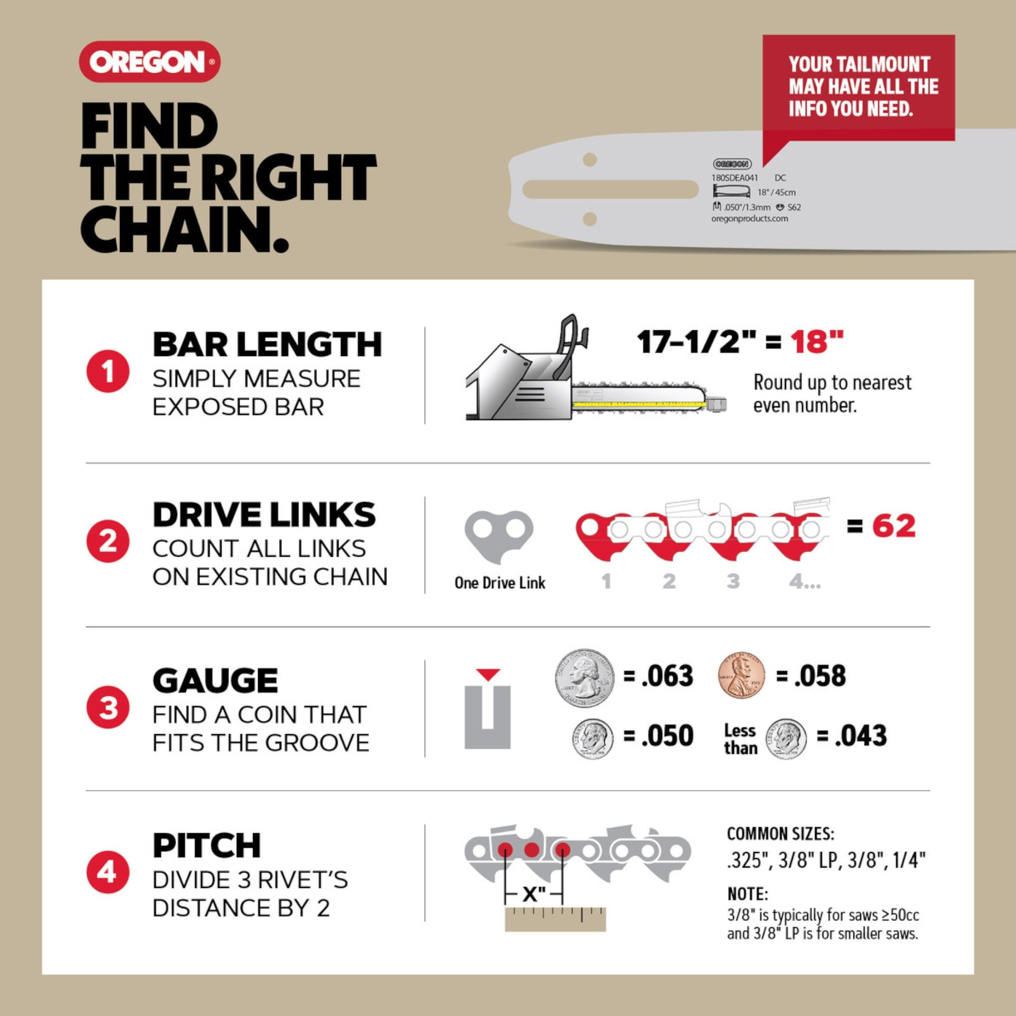 The Oregon 91VXL 3/8" Low Profile™ High Performance Chain is the ideal choice for arborists and orchardists who need a powerful but lightweight chainsaw. Designed for professional applications, this chain offers extended cutting life thanks to its long top cutting edges, allowing you to work more efficiently and precisely. With a pitch of 3/8" Low Profile™ and a thickness of 1.3 mm (.050"), the 91VXL chain offers excellent cutting performance with less kickback, making it a safe choice for professional use. The chain has 56 links of chain drive and is suitable for saws up to 42 cm³. Thanks to LubriTec™ technology, the chain and guide bar are continuously lubricated, which minimises friction and extends the service life of the tool. The chain also offers excellent corrosion resistance thanks to blued cutters, which provide high-quality protection against wear and the effects of the weather.