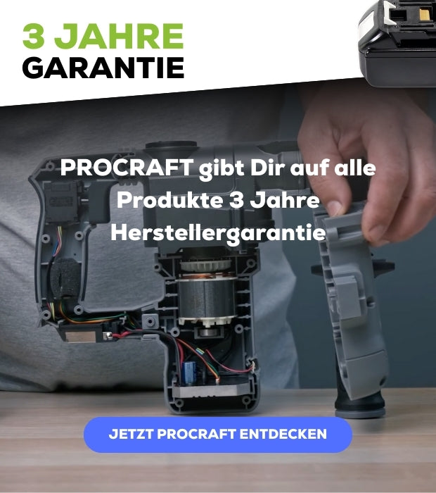 Alle PROCRAFT Werkzeuge erfüllen europäische Sicherheits- und Qualitätsstandards. Zusätzlich bietet PROCRAFT bis zu 3 Jahre Herstellergarantie.