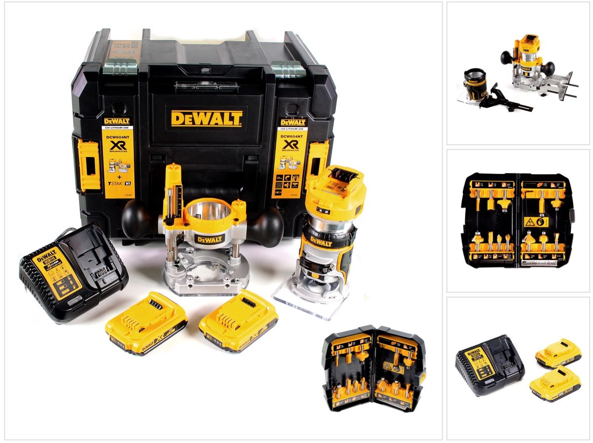 DeWalt DCW 604 D2 Affleureuse/Défonceuse sans fil 18V 55 mm + 2x Batteries 2,0 Ah + Chargeur rapide + Jeu de fraises, 12 pièces + Coffret de transport