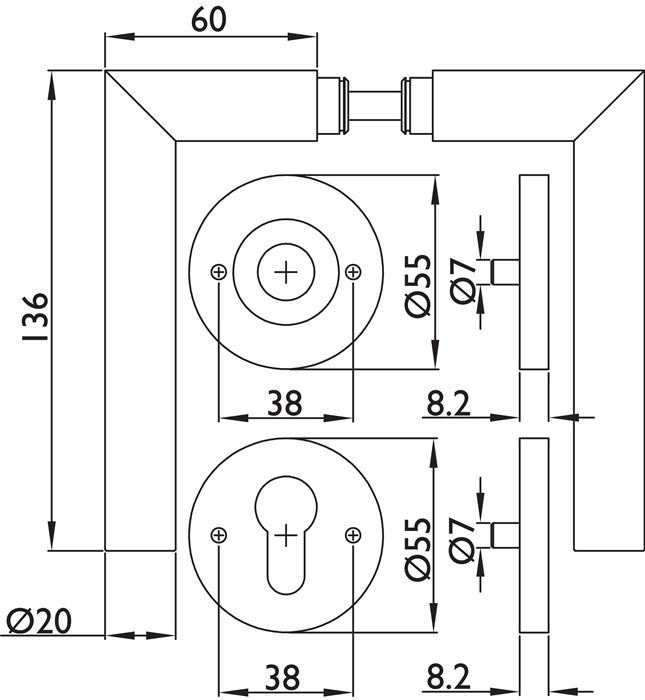 avec matériel de fixation, adapté à l'épaisseur de porte : PZ / PZW = 40-58 mm, avec ressort de rappel - tige carrée de 9 mm Ne convient pas pour les portes d'issue de secours !
