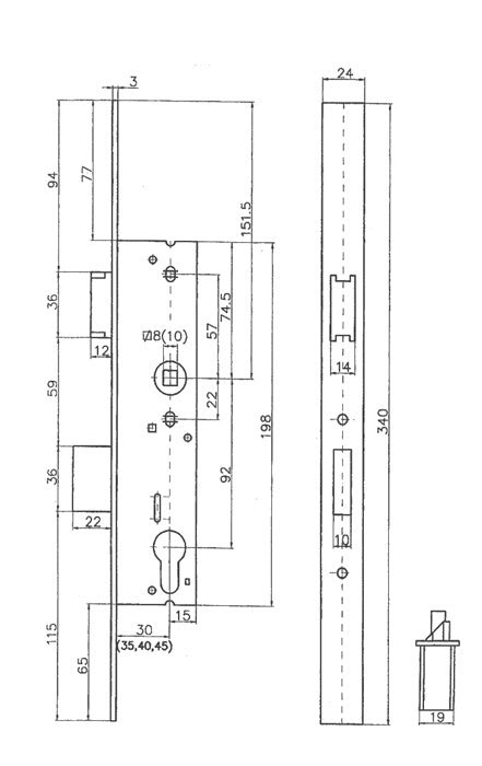 Version PZW - 1 tour - avec alternance - à chant - galvanisé - avec têtière de rénovation, extra longue 340mm, raccourcissable - distance 92 mm - carré 10 mm - utilisable DIN gauche / droite - pêne demi-tour et pêne dormant nickelés - sans gâche