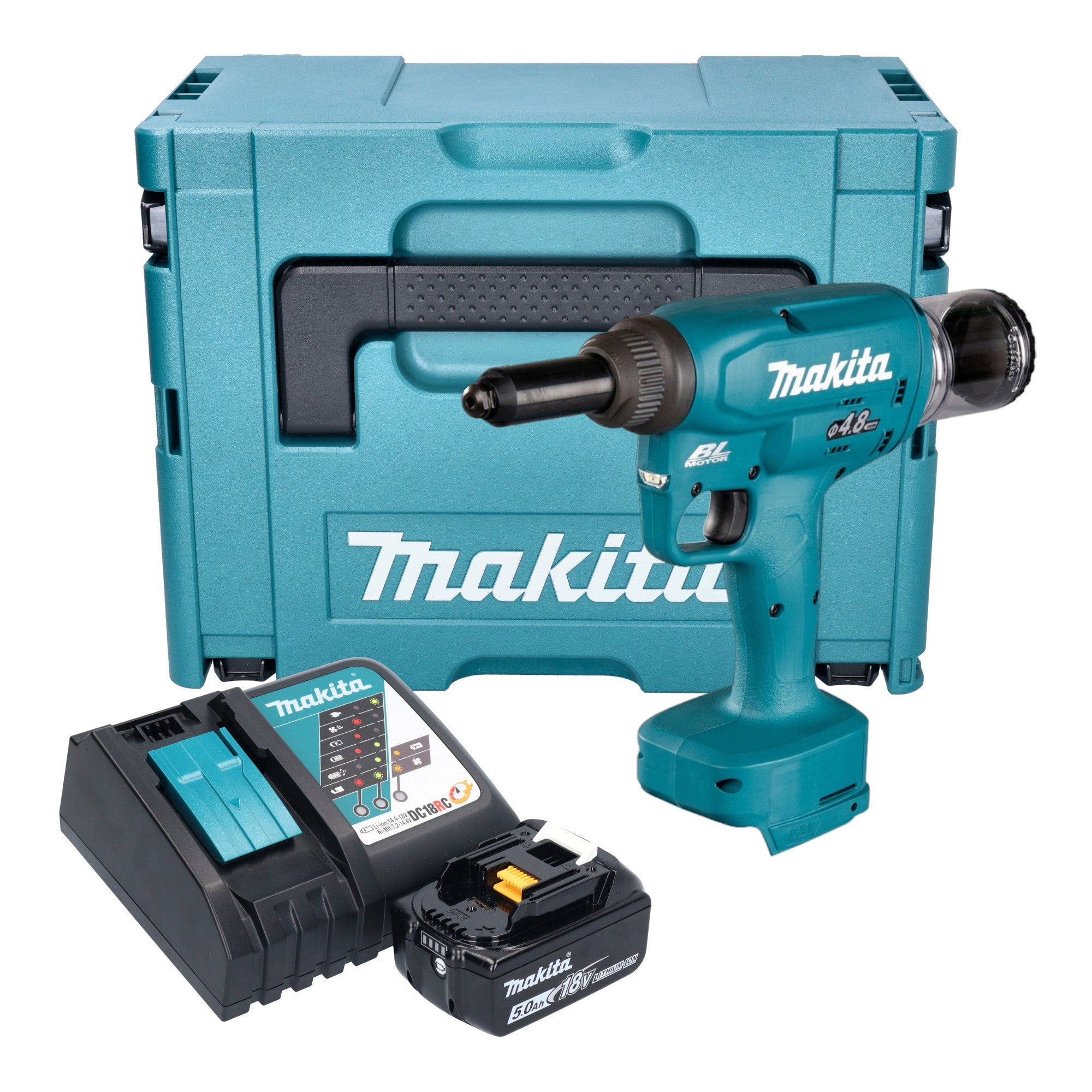 Makita DRV 150 RT1J Rivettatrice a batteria 18 V 10 kN 2,4 - 4,8 mm Brushless + 1x batteria 5,0 Ah + caricabatteria + Makpac