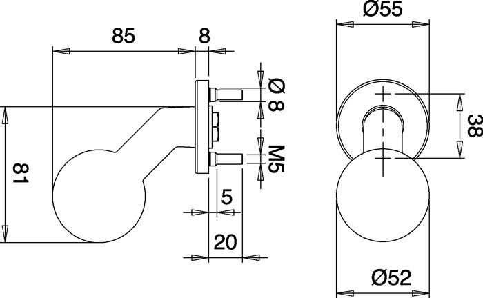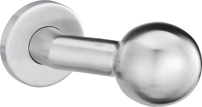 in acciaio inox - su rosone rotondo - testa sferica a gomito - Ø rosone 55 mm - altezza 85 mm - spessore rosone 8 mm - interasse fori vite 38 mm