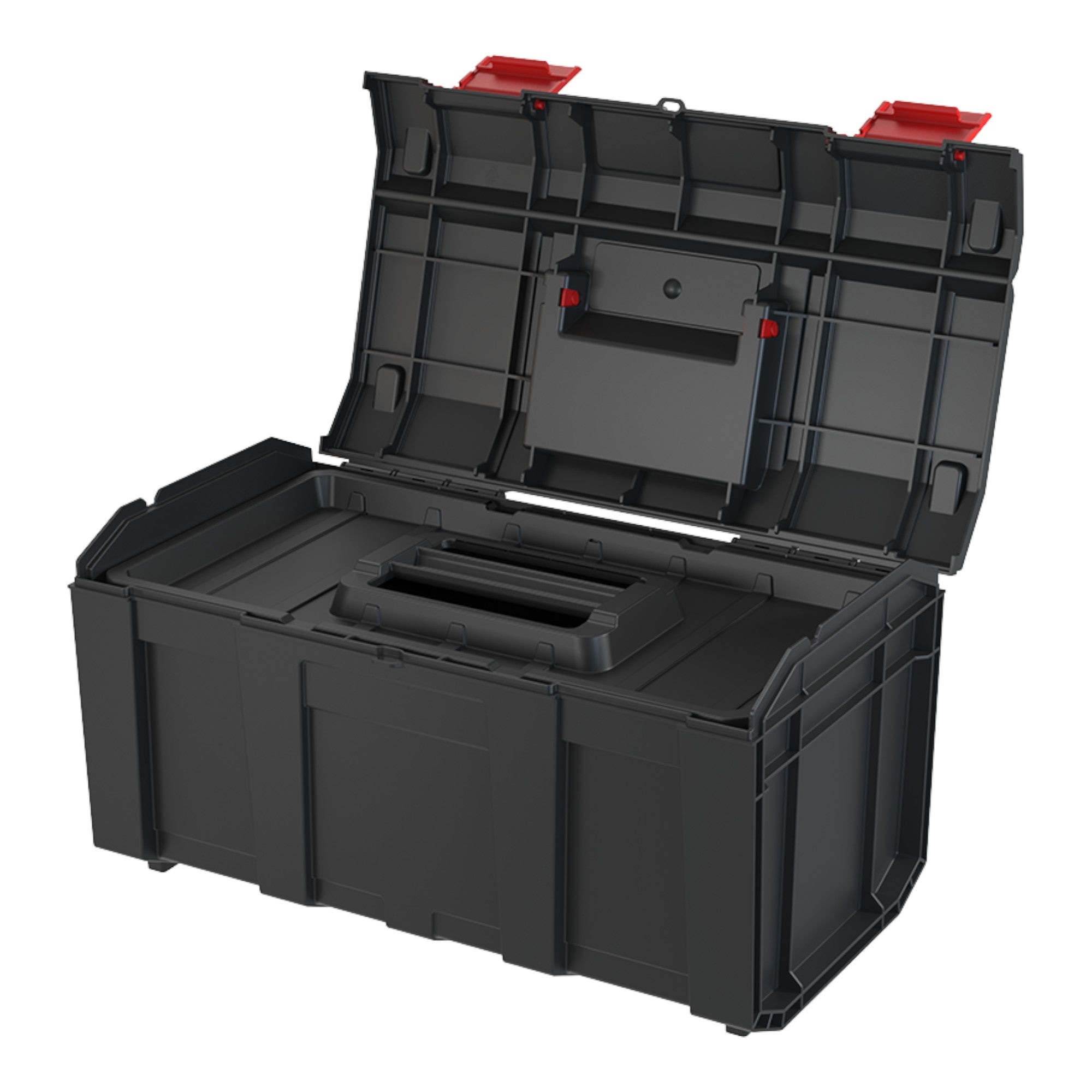 Die Qbrick Regular R-BOX 16 ist ein langlebiger und geräumiger Werkzeugkasten, der sich sowohl für den privaten als auch für den professionellen Einsatz eignet und mit praktischen Schneidrillen sowie einem Vorhängeschlossloch zusätzliche Sicherheit bietet; die verstärkte Konstruktion mit Versteifungsrippen sorgt für hohe Stabilität und Haltbarkeit, während ein ergonomischer Griff, stabile Verriegelungen und ein funktionales internes Tablett den Benutzerkomfort erhöhen und eine optimale Arbeitsorganisation ermöglichen.
