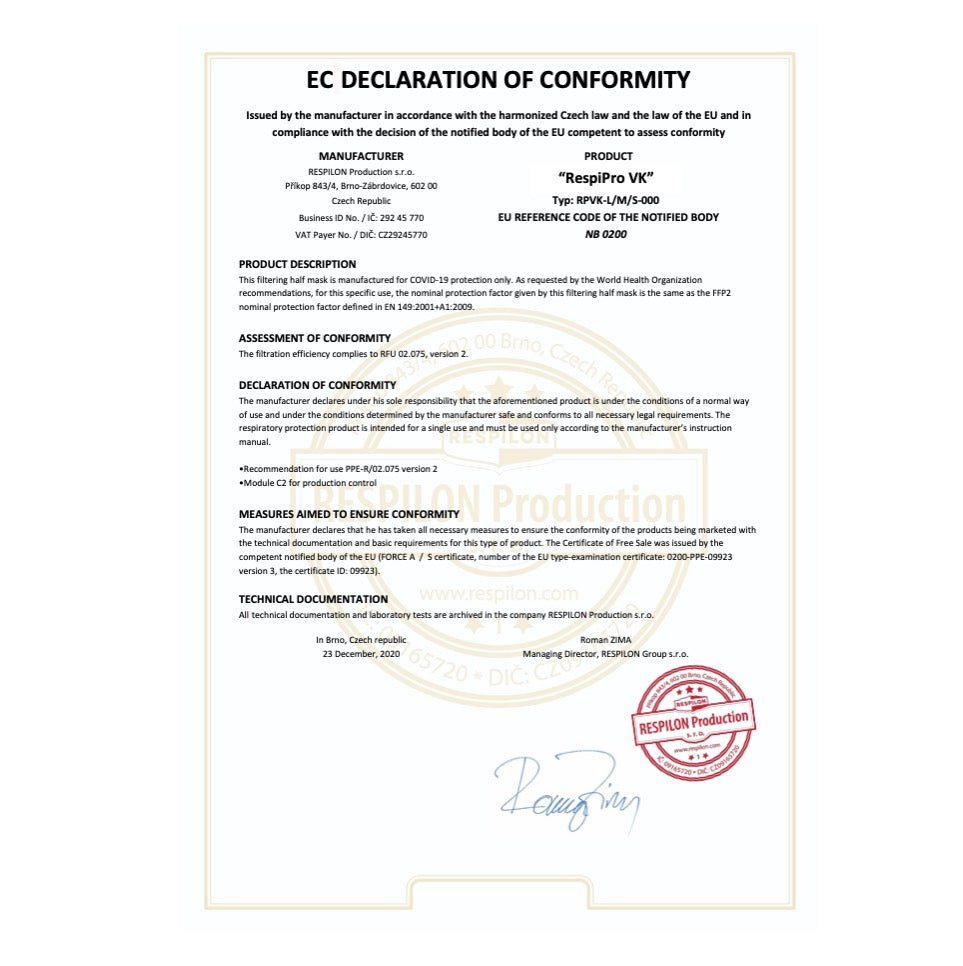 La mascarilla respiratoria VK RespiPro tiene una alta filtración del 99,7-99,9%. Lo especial de la mascarilla es que se puede reutilizar hasta una semana (o más precisamente 30 horas). La pinza nasal de la máscara hace que sea cómoda de usar y se puede ajustar fácilmente a la nariz. Además, en el interior y el exterior de la máscara se procesa óxido de cobre especialmente incorporado. Por supuesto, la mascarilla está certificada según la norma europea RFU 02.075, versión 2.