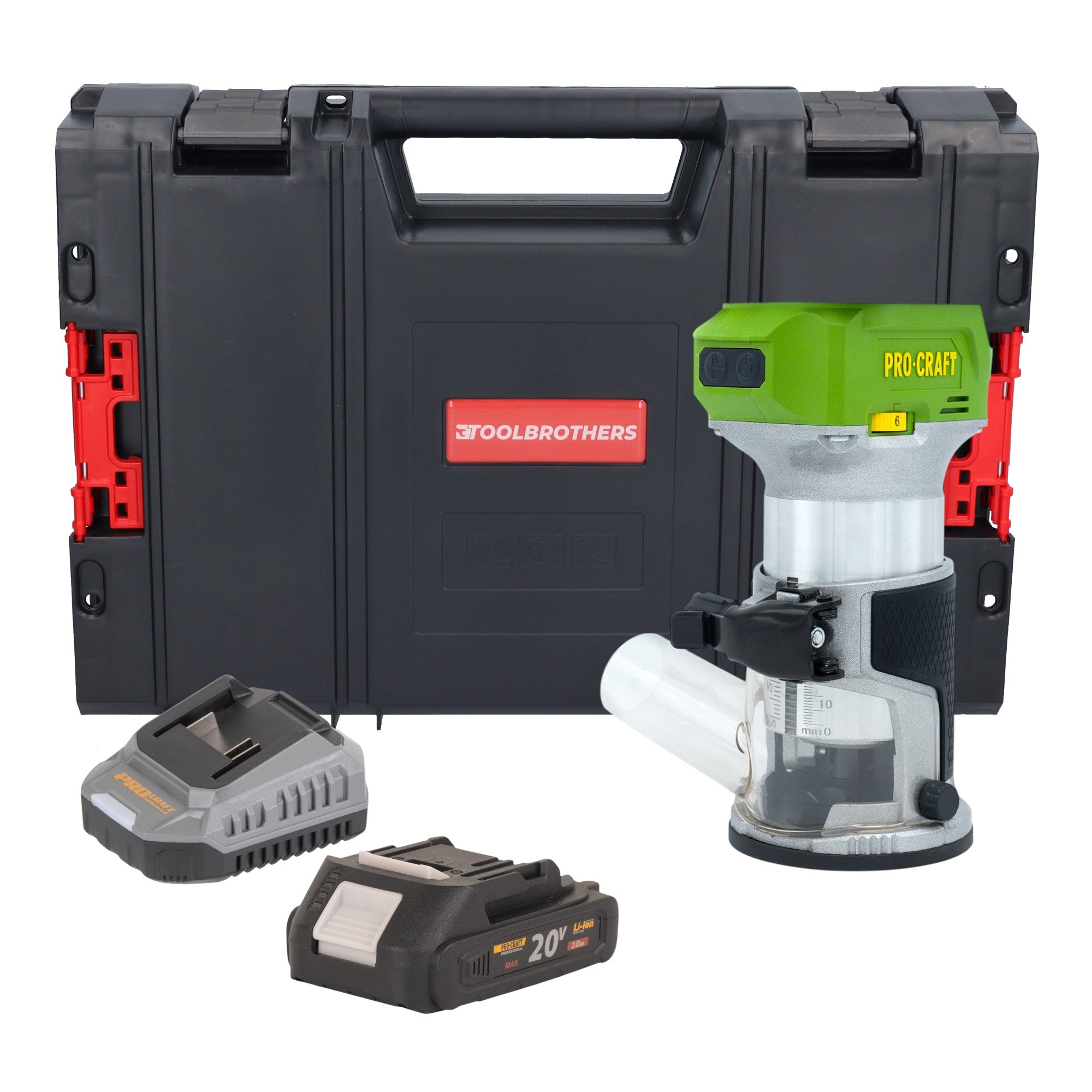 Akumulatorowa frezarka wielofunkcyjna Procraft POB24bb 20 V 6/8 mm bezszczotkowa + 1x akumulator 2,0 Ah + ładowarka + walizka narzędziowa RHINO