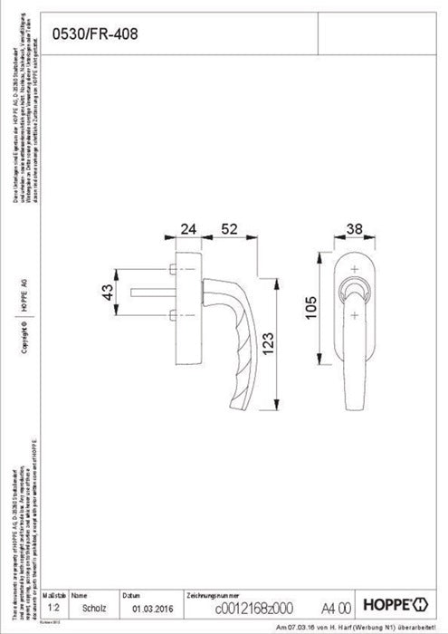 Manilla para ventana HOPPE Atlanta 0530/FR-408 aluminio F9 / color acero (8000347453)