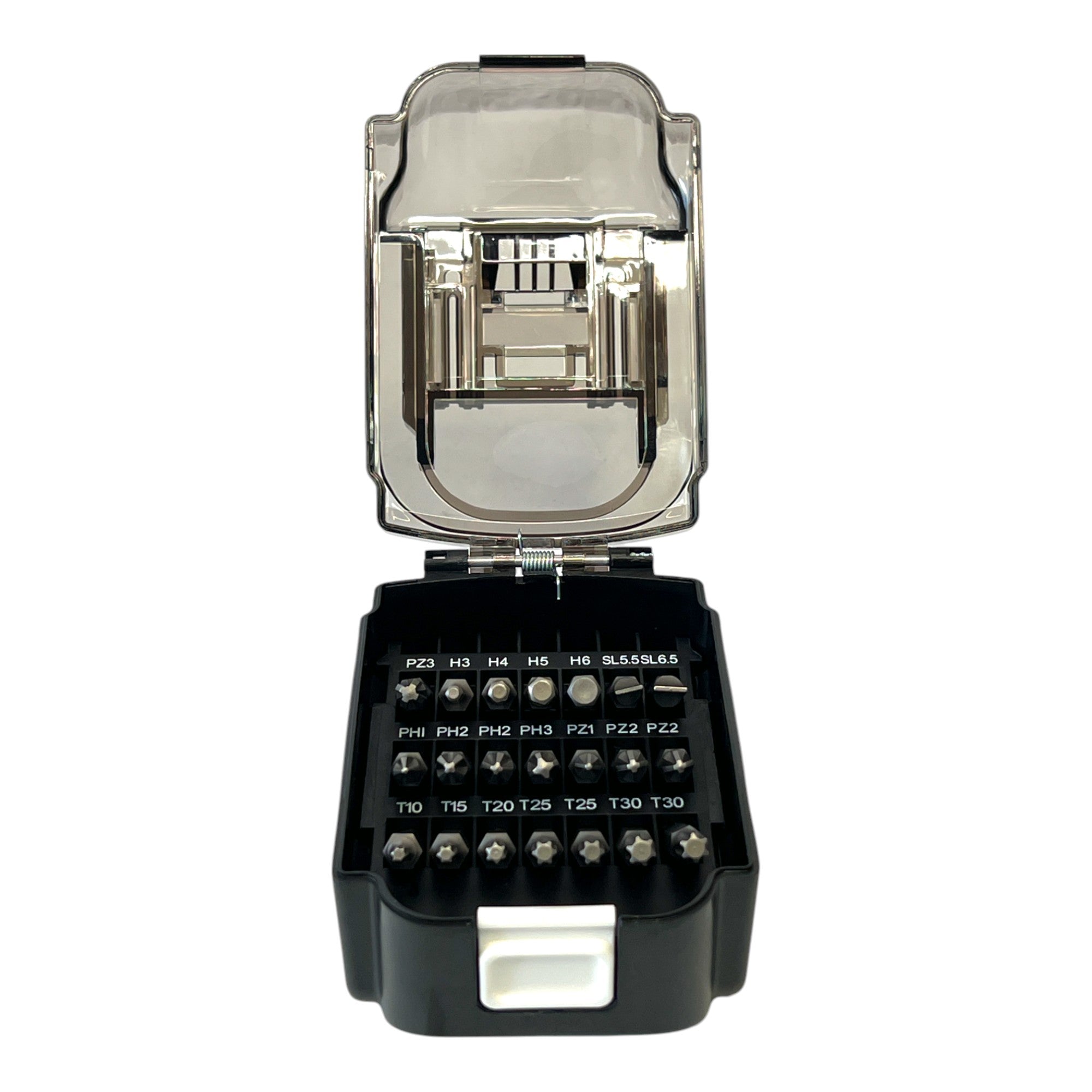 Makita oferuje 21-częściowy zestaw bitów w kompaktowej obudowie opartej na konstrukcji akumulatora. Bity są bezpiecznie przechowywane, a pokrywę można otworzyć jednym naciśnięciem przycisku. Bity można szybko i łatwo wymieniać za pomocą dołączonego uchwytu do szybkiej wymiany bitów. Makita to wiodący producent elektronarzędzi, charakteryzujący się długą tradycją i wysoką jakością wykonania.