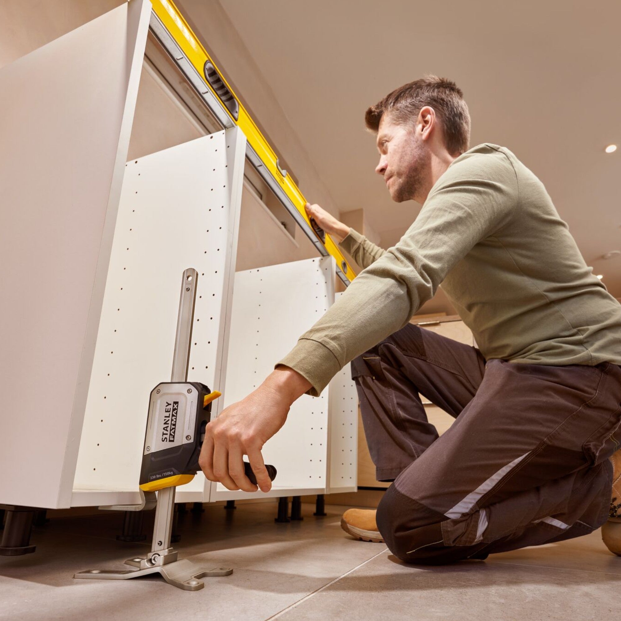 Jednoręczne narzędzie montażowe Stanley Fatmax FMHT83552-1 TradeLift to niezastąpione narzędzie do profesjonalnych zastosowań, które umożliwia wydajną i bezpieczną pracę jednoosobową. Dzięki imponującemu udźwigowi do 150 kg na narzędzie, idealnie nadaje się do różnych zastosowań, takich jak montaż kuchni, suchej zabudowy, stolarstwo, prace stolarskie, prace podłogowe oraz montaż drzwi i okien. Urządzenie umożliwia podnoszenie, opuszczanie, zaciskanie, wyrównywanie i przytrzymywanie ciężkich przedmiotów przy minimalnym wysiłku, dzięki możliwości wygodnej obsługi za pomocą stopy, przy jednoczesnym zachowaniu wolnych rąk. Intuicyjna obsługa umożliwia precyzyjne podnoszenie i kontrolowane opuszczanie, a wpuszczony przycisk zwalniający zapobiega przypadkowej aktywacji. Dla szczególnie precyzyjnej pracy, precyzyjna regulacja oferuje stopniowe opuszczanie płyty podnoszącej do 2,5 mm. Kątowa krawędź ułatwia wsuwanie pod płaskie przedmioty, a duża płyta podstawy i cztery otwory z łbem stożkowym zapewniają stabilność i bezpieczne zakotwiczenie, nawet w przypadku wymagających prac. Zamknięta obudowa z metalowej płyty zapewnia wysoką trwałość i chroni przed kurzem i brudem, a ergonomicznie wyprofilowany uchwyt zapewnia wygodę i kontrolę. Dzięki udźwigowi 7-220 mm i kompaktowym wymiarom podstawy 6 x 170 x 125 mm, podnośnik Stanley Fatmax TradeLift jest idealnym rozwiązaniem do precyzyjnej i energooszczędnej pracy na placu budowy lub w warsztacie.