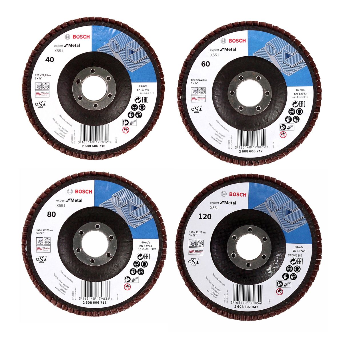 Juego de discos de láminas Bosch X551 Expert for Metal 125 mm, K40, K60, K80, K120 10 piezas cada uno