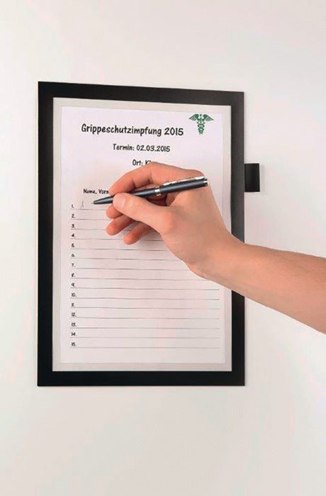 autoadhesivo · formato DIN A4 · frontal magnético para cambiar la información de forma rápida y sencilla · rotulación directa en el documento · altura de llenado hasta 5 hojas de 80 g/m² · portalápices para todos los bolígrafos con clip de fijación · se adhiere permanentemente a todas las superficies lisas