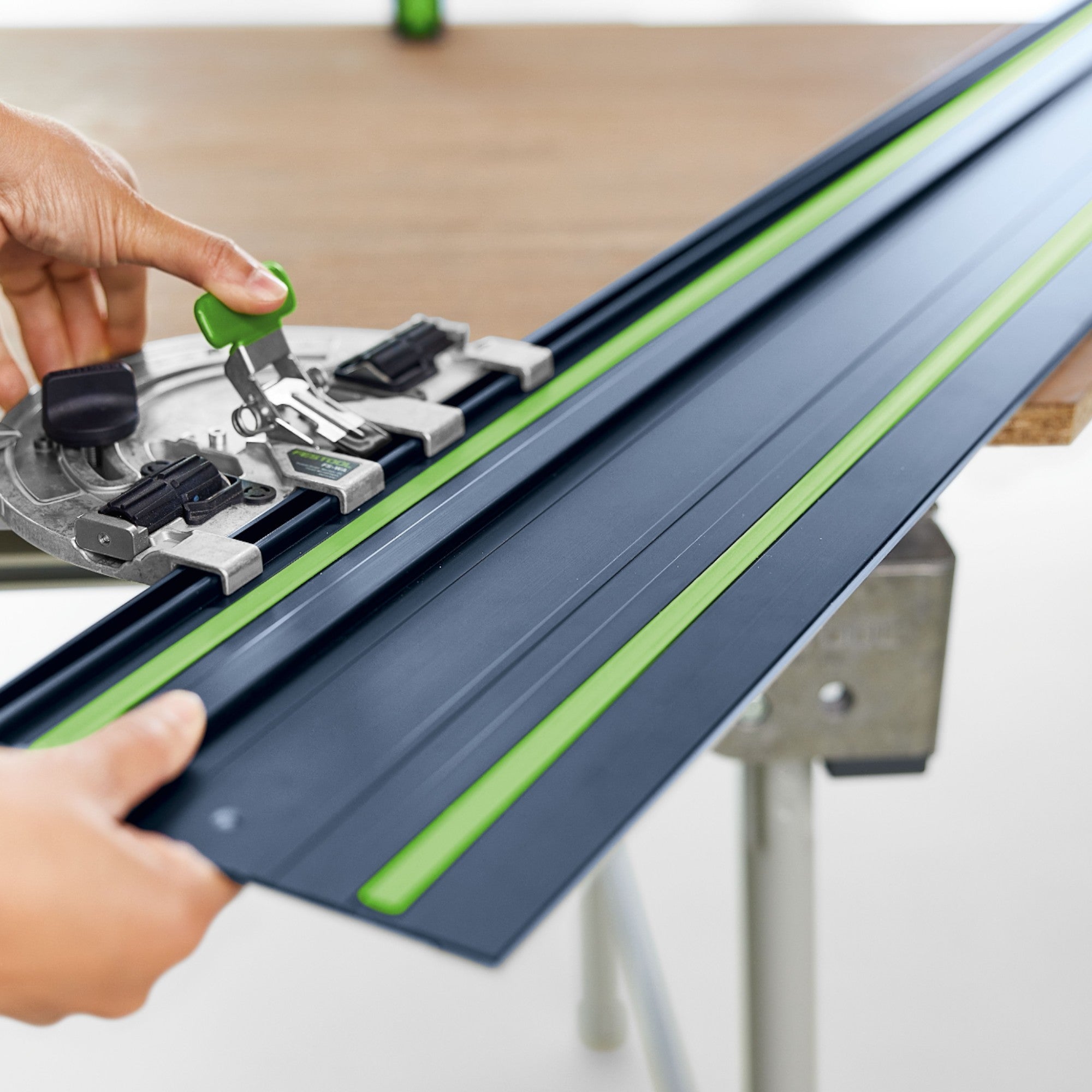 El riel guía FS 1400/2 BL de Festool no es sólo una herramienta de precisión de primera clase, sino también un modelo de edición limitada de aniversario para conmemorar el centenario de Festool, en un exclusivo diseño azul. Como parte de la campaña especial "100 años de Festool", rinde homenaje al gremio y a todos aquellos que han trabajado con Festool desde 1925. El carril guía de 1.400 mm de longitud impresiona por su robusta y ligera construcción de aluminio y garantiza cortes y ranuras precisos y rectos, tanto si se utiliza una sierra de inmersión como una fresadora. Gracias a las mordazas de guía ajustables sin herramientas de las sierras de inmersión, la máquina puede guiarse sobre el carril sin juego, garantizando la máxima precisión. El labio de goma a lo largo del trazado sirve de protección contra astillas y garantiza cortes sin desgarros, incluso en ángulos difíciles. Para trabajos de fresado de alta precisión, el raíl ofrece la posibilidad de utilizar un tope guía para fresadoras, lo que permite realizar ranuras precisas. También se pueden realizar cortes diagonales en un abrir y cerrar de ojos: el ángulo deseado se transfiere directamente de la pieza o la pared al carril guía mediante la plantilla combinada. Una almohadilla adhesiva antideslizante garantiza un agarre estable, incluso en materiales lisos, y además protege las superficies sensibles de arañazos. La ranura adicional integrada para accesorios abre muchas otras posibilidades de aplicación y convierte a la FS 1400/2 BL en un auténtico multitalento. Una almohadilla deslizante facilita el guiado de la máquina sobre el carril y garantiza un trabajo cómodo. Ya sea para la fabricación de muebles, el equipamiento de interiores, la construcción en madera o el mecanizado de fachadas, este carril guía de edición limitada es sinónimo de ahorro de tiempo, precisión y calidad al más alto nivel.