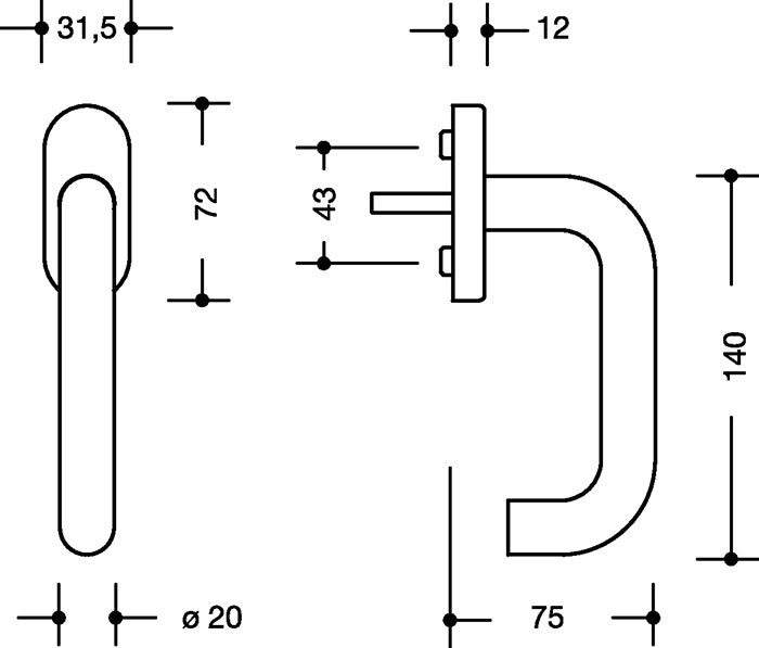 Acero inoxidable · diámetro 21,3 mm · 140 mm de largo · con pasador cuadrado de 7 mm · la manilla para ventana cumple los requisitos de DIN 18040 · roseta ovalada 72 x 31,5 mm · con pasador de soporte · se suministra sin tornillos de fijación · superficie de la manilla para ventana y roseta son suelo mate