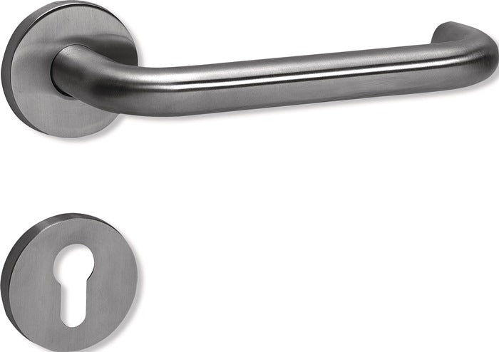Conjunto de ambiente · en técnica H según DIN 18255 y DIN EN 1906, de acero inoxidable, superficie mate, compuesto por: tirador de puerta 112XAH, 21,3 mm de diámetro, rosetas redondas 305.21XAH y 306.23XA, con módulo de sujeción integrado con soporte de resorte · el mango cumple con los requisitos DIN EN 179 y DIN 18040 · Categoría de uso: Clase 4 Juego con pasador cuadrado 8 - 8,5 mm · ¡Sugerencia de implementación! ¡Verifique todas las dimensiones y condiciones estructurales al realizar un pedido!