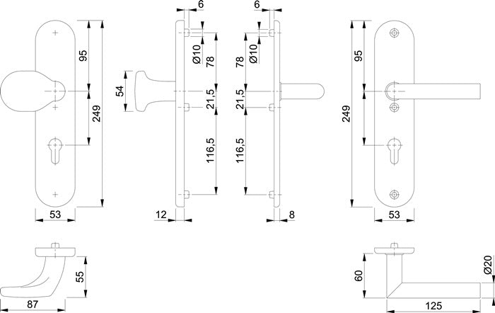 para puertas finales - subestructura de zamak en placa exterior e interior - con pomo fijo - unión de pernos de perfil FDW - atornilladura visible - PZ - incluido material de fijación M6 - altura del canto de la placa exterior 12 mm - distancia 72 mm - cuadrado 8 mm - DIN izquierda / derecha - clase de resistencia ES 0