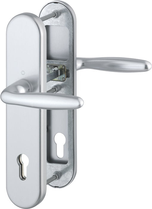 para puertas finales - antirrobo según DIN 18257 - subestructura de acero en placa exterior e interior - con paquete de muelles de retorno - exterior: manivela, cabeza fija (remontable) - interior: manilla suelta, con conexión rápida de pasador - atornilladura oculta de alta resistencia - altura del canto de la placa del pomo: 12 mm - DIN izquierda / derecha - clase de resistencia ES 1