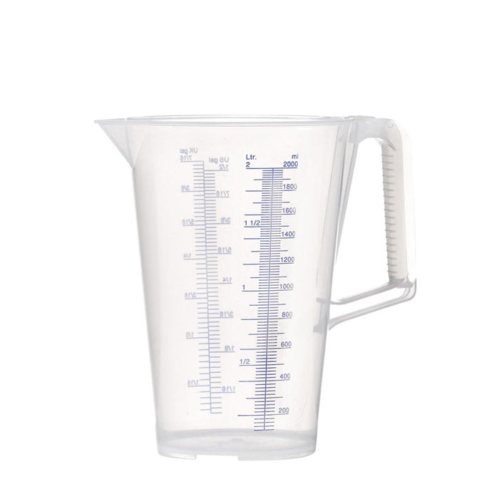 fabricado en polipropileno - escala impresa en azul y en relieve en MI y GAL a cada lado del vaso medidor - asa ergonómica con ranuras para un mejor agarre - resistente a medios neutros, aceites, ácidos y alcohol - sin BPA - apto para alimentos de conformidad con (UE) n.º 20/2011 y FDA § 21 CFR 177.1520