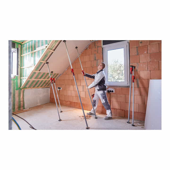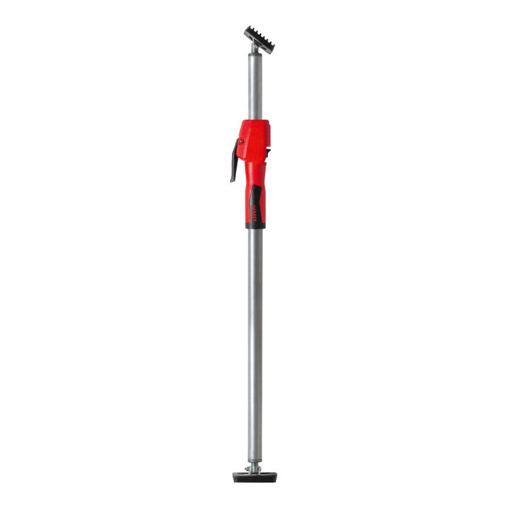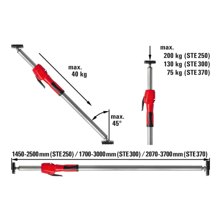 für bis zu maximal bis 160 kg Tragfähigkeit – abhängig von der entsprechenden Stützengröße – bei maximaler Auszugslänge (bei komplett eingefahrener Teleskopstange bis zu 350 kg) · durch gummierte PVC-Kontaktflächen oben und unten durch die im Griff integrierte Rutschsicherung · Positionieren und Halten unterschiedlichster Materialien: durch stabile Stahlrohr-Konstruktion in drei Größen – teleskopierbar auf bis zu 3,70 m · durch 9 x 7 cm große Auflageplatten mit einem Schwenkbereich von -45° bis +45°