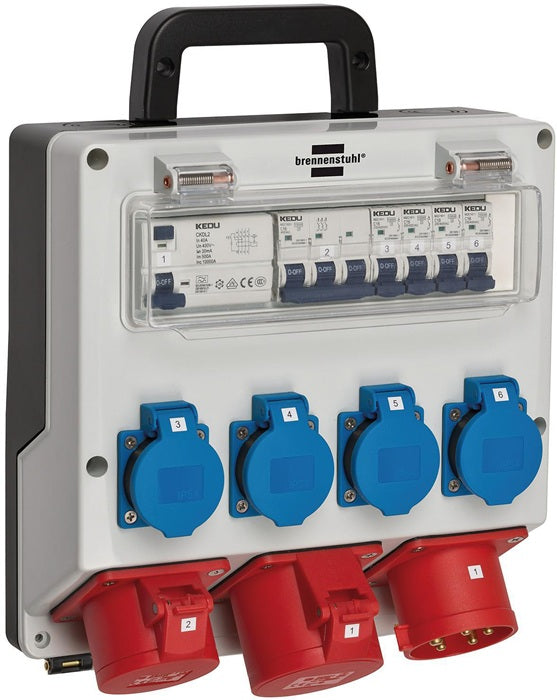 robustes, bruch- und schlagfestes Kunststoffgehäuse · zur stabilen Wandbefestigung geeignet · mit ergonomisch geformtem Tragegriff für bequemen Transport · Schutzabdeckung für Sicherungen · mit FI-Personenschutz-Schalter 30mA für mehr Sicherheit · Schutzkontakt-Steckdosen 230 V auf allen 3 Phasen verteilt