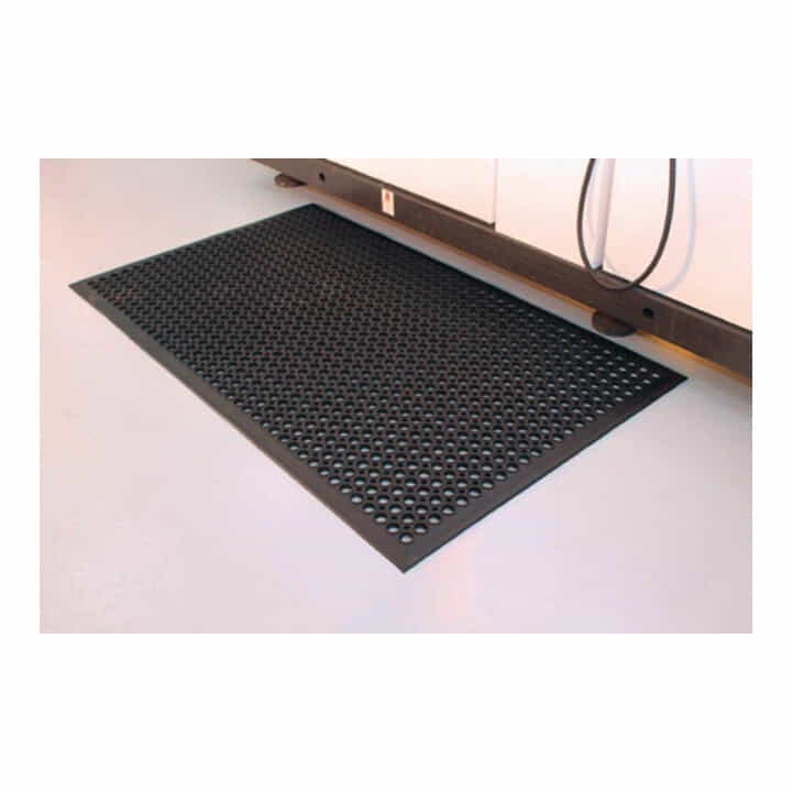 vielseitige und ökonomische Anti-Ermüdungsmatte für trockene industrielle Steharbeitsplätze · SBR-Gummi mit gelochter Oberfläche · Temperaturbeständigkeit von -20 °C bis +130 °C · Mattenstärke 10 mm · Rutschhemmung R10 nach EN 13552 · Farbe schwarz