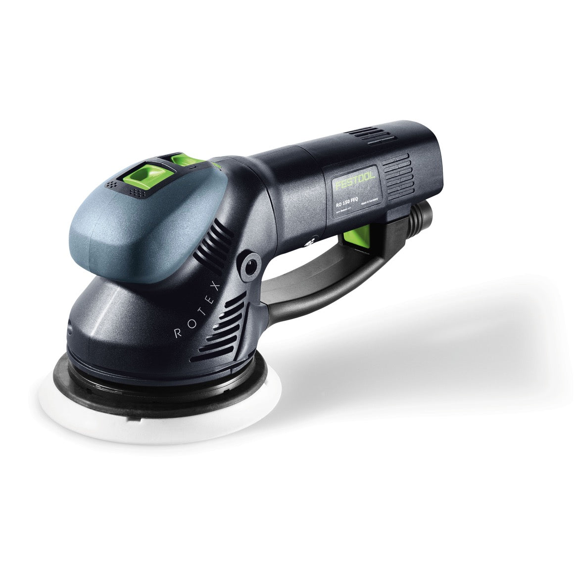 Der Rotationsschleifer RO 150 FEQ von Festool eignet sich hervorragend zum Abschleifen alter Farben und Lack, zum Bearbeiten von Holzwerkstoffen und für Renovierungsarbeiten, wie beispielsweise das Schleifen von Treppenstufen. Durch die handliche Ergonomie, mit optimalen Griffmöglichkeiten ist das Arbeiten äußerst komfortabel. Weitere Anwendungen, wie das Schleifen und Polieren von Mineralwerkstoffen, das Vor- und Grobschleifen von Spachtel und hologrammfreies Polieren stellen für den RO 150 FEQ kein Problem dar. Das Gerät überzeugt mit den vielfältigen Einsatzmöglichkeiten und vereint Grob-,  Feinschleifer und Polierer in einem Gerät. Mit der Rotex Kurvenbahn erfolgt ein sehr starker Abtrag und durch die Exzenterbewegung können hochwertige und riefenfreie Oberflächen erzeugt werden. Mit Hilfe des Festool Protectors kann selbst sehr nah an Rändern gearbeitet werden und mit dem FastFix-System kann der Schleifteller schnell, mühe- und werkzeuglos gewechselt werden. Durch den neuen MPE-Schleifschuh und Schleifteller aus hochverschleißfreiem Werkstoff ist eine lange Lebensdauer der Teile garantiert.