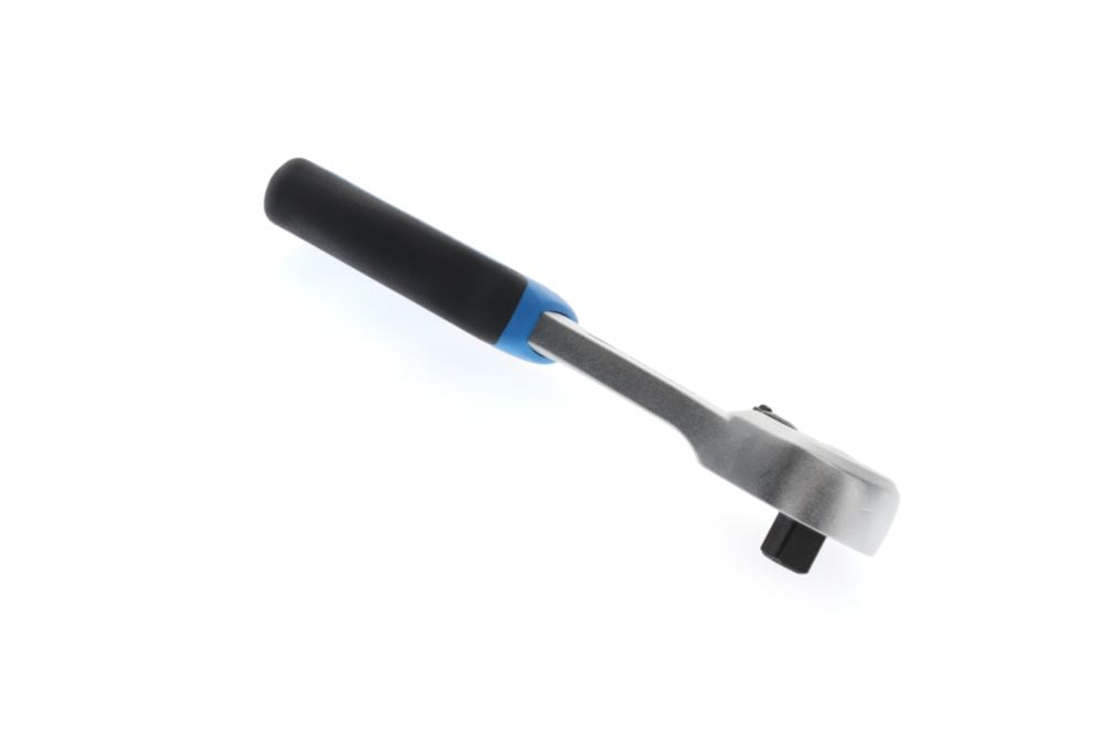 10 mm (3/8 ″)-Vierkantantrieb · 2-Komponenten-Griff mit Aufhängeloch · CV-Stahl · Nussverriegelungsfunktion mit Druckknopfauslösung · tropfenförmiger Kopf für engste Schraubstellen · Rückschwenkwinkel 6º 60 Zähne DIN 3122 / ISO 3315