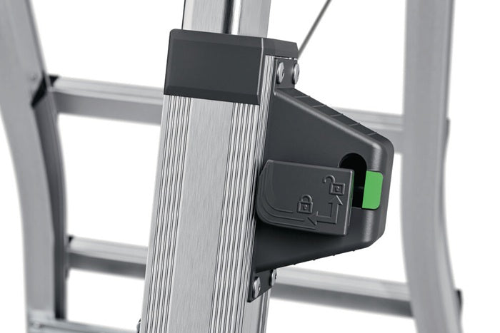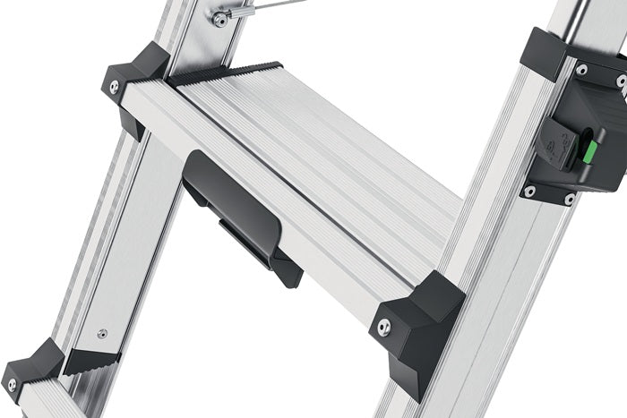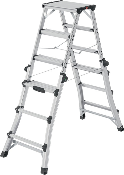 Aluminium · teleskopierbare Stufenstehleiter für flexible Arbeitshöhen · Steig- und Stützholme auf 2 x 4, 2 x 5 oder 2 x 6 Stufen einstellbar · beidseitig begehbar · Stufen-/Sprossen-Kombination mit rutschsicherer, geriffelter Auftrittsfläche · treppengängig einsetzbar, max. Treppenverstellung 430 mm · platzsparend · max. Gesamtbelastung 150 kg