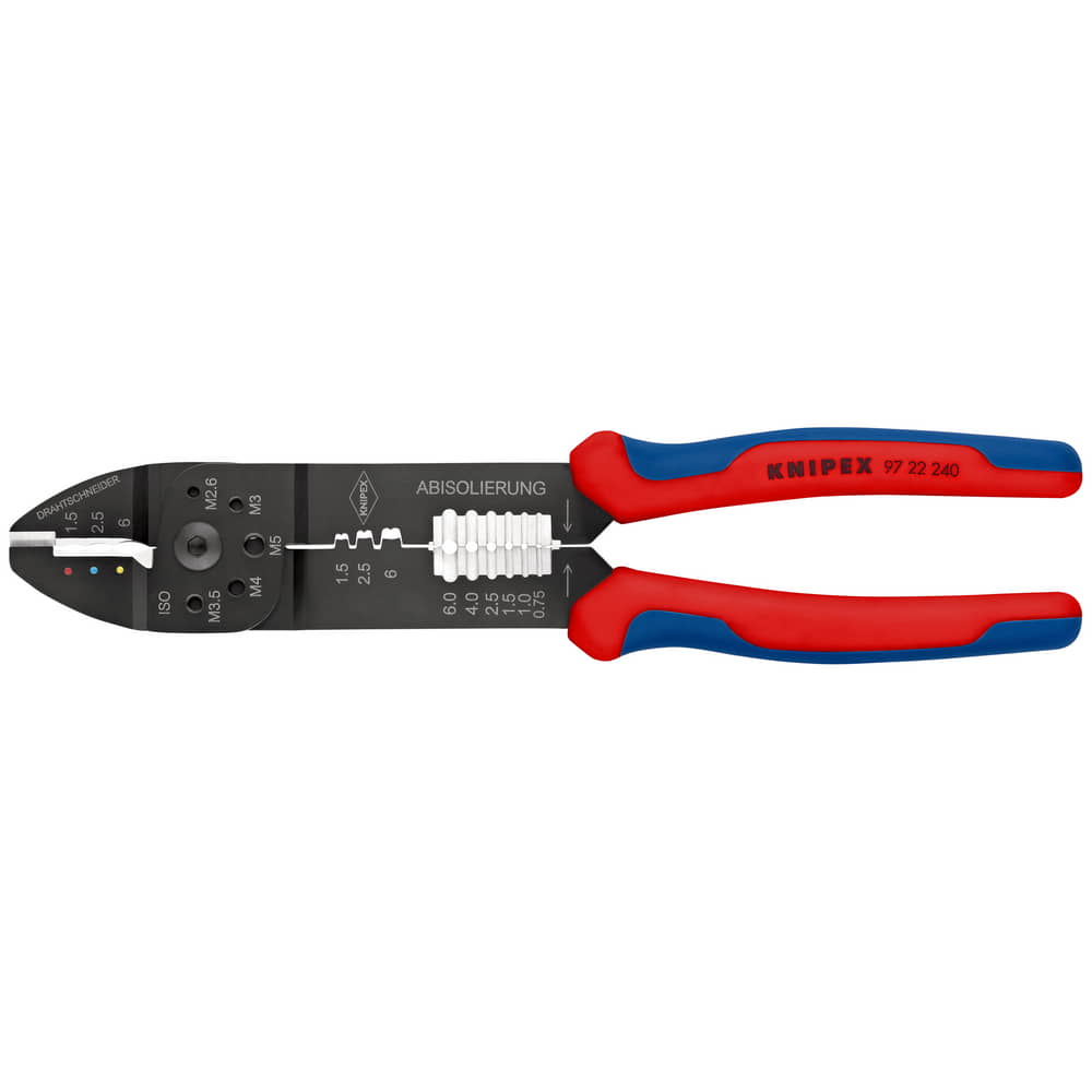 zum Kabelschneiden, Abisolieren von Drähten und Quetschen von isolierten und unisolierten Kabelschuhen und Steckverbindern und offenen Stechverbindern · mit Gewindelöchern zum Abschneiden von Cu- und Ms-Gewindestiften M 2,6 / 3 / 3,5 / 4 / 5 · aus hochfestem Spezialstahl Zange schwarz lackiert · mit Mehrkomponenten-Hüllen