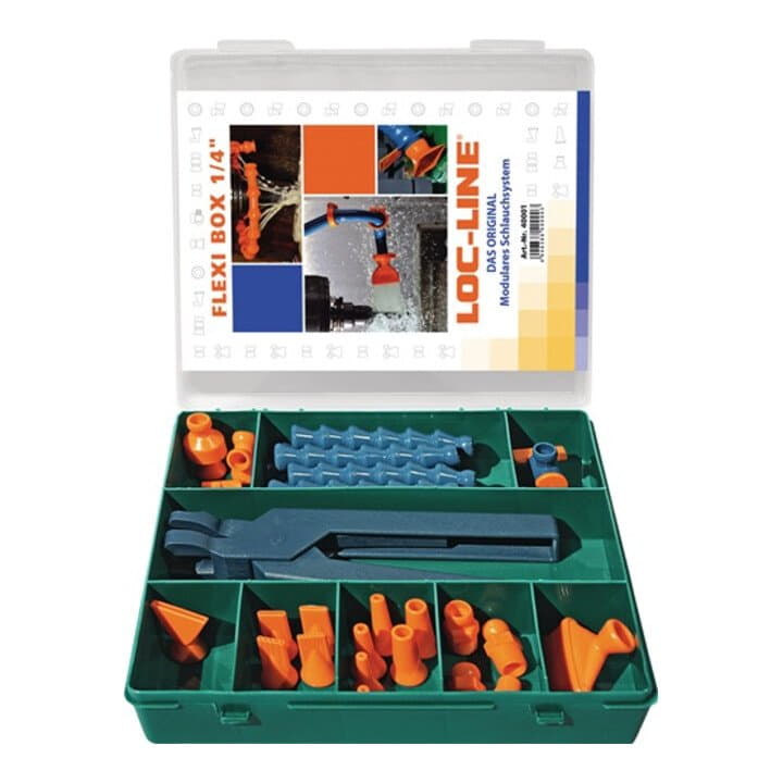 Loc-Line · 6,35 mm (1/4 Zoll) · Set und Grundausstattung für die gängigsten Anwendungen · Art.-Nr. 4000 879 841 bestehend aus: 8 Stück Gelenkschläuche, je 90 mm 2 Stück Runddüsen 1,5 mm Ø 2 Stück Runddüsen 3 mm Ø 2 Stück Runddüsen 6 mm Ø 1 Stück Breitstrahldüse 25 mm 1 Stück Flachdüse 12x1 mm 1 Stück Flachdüse 12x1,5 mm 1 Stück 5-Lochdüse 1,5 mm Ø 1 Stück 7-Lochdüse 1 mm Ø 1 Stück Gelenkduschdüse 16x1 mm Ø 1 Stück Klemmring mit Schraube 1 Stück Y-Abzweig 2 Stück Gewindenippel NPT R 3,18 mm (1/8") 2 Stück Gewindenippel NPT R 6,35 mm (1/4") 1 Stück Absperrventil mit Gelenkanschluss 1 Stück Rückschlagventil 1 Stück Montagezange