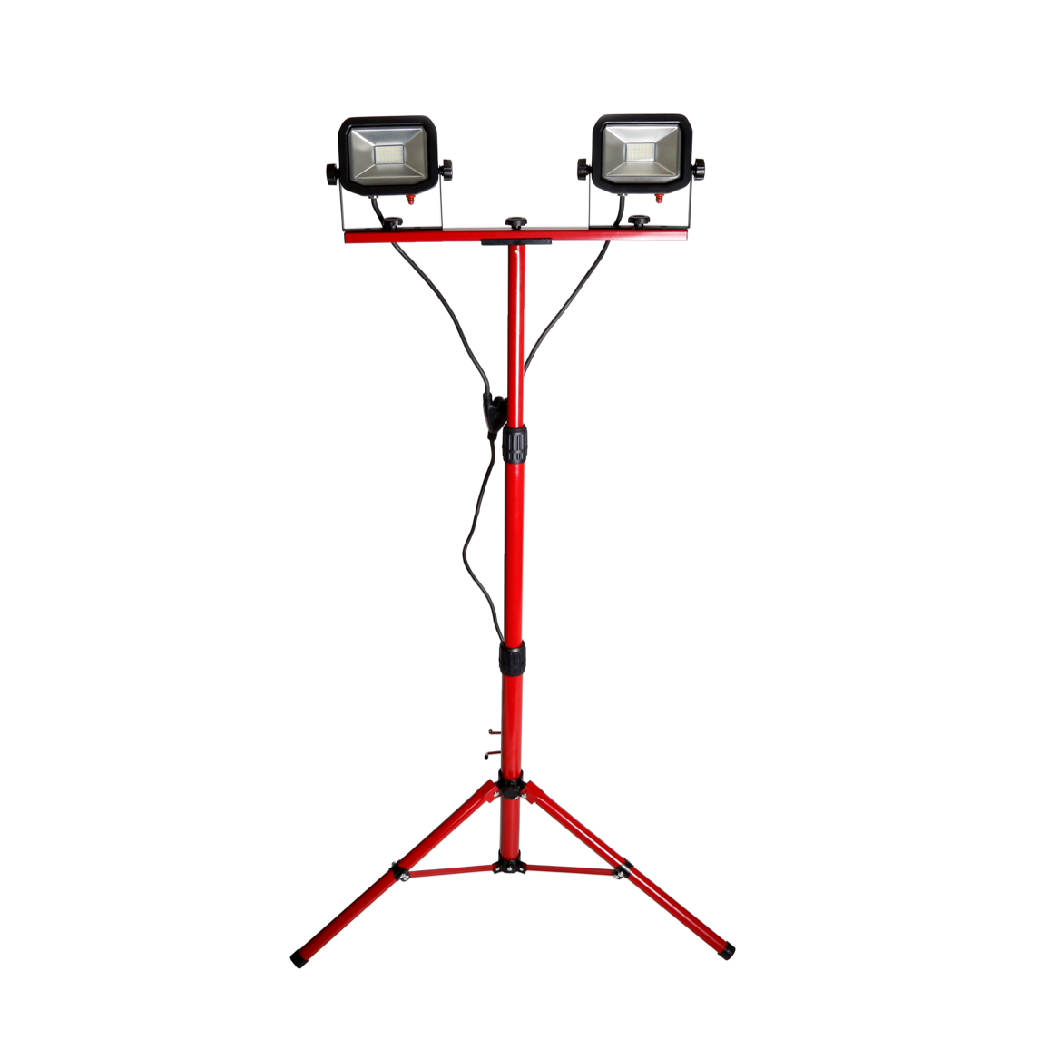Der Luceco Doppelstrahler lässt sich, dank des höhenverstellbaren Stativs, einfach bis auf 1,5m ausfahren. Für einen sicheren Stand des Strahlers sorgen drei aus robusten Stahl gefertigte Füße. Die beiden schwenkbaren Flutlichter können unabhängig voneinander ein- und ausgeschaltet werden. Der Winkel des Lichtstrahls ist mit Hilfe von Schrauben bis zu 95° verstellbar. Das weiße, neutrale Licht fühlt sich, beim Arbeiten im Inn- und Außenbereich, angenehm an. Dazu ist der Strahler nach IP 65 vor Staub und Spritzwasser geschützt. Aufgrund moderner LED Technologie spart man 90% der Energie im Vergleich zu einer Halogenlampe. Die Lebensdauer beträgt laut Herstellerangaben 30.000 Stunden.