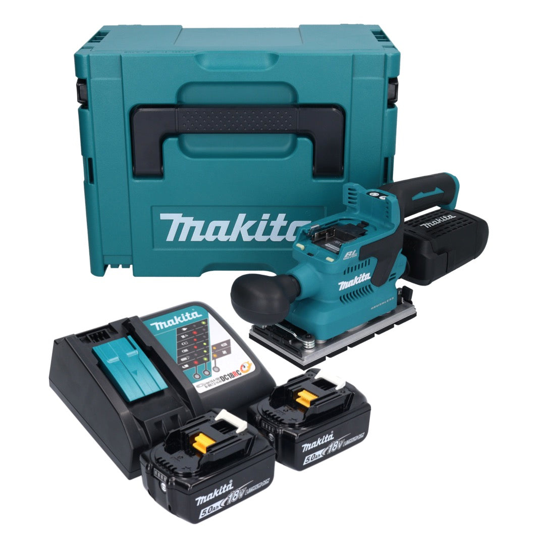 Makita DBO 381 RTJU Akku Schwingschleifer 18 V 93 x 185 mm Brushless + 2x Akku 5,0 Ah + Ladegerät + Makpac