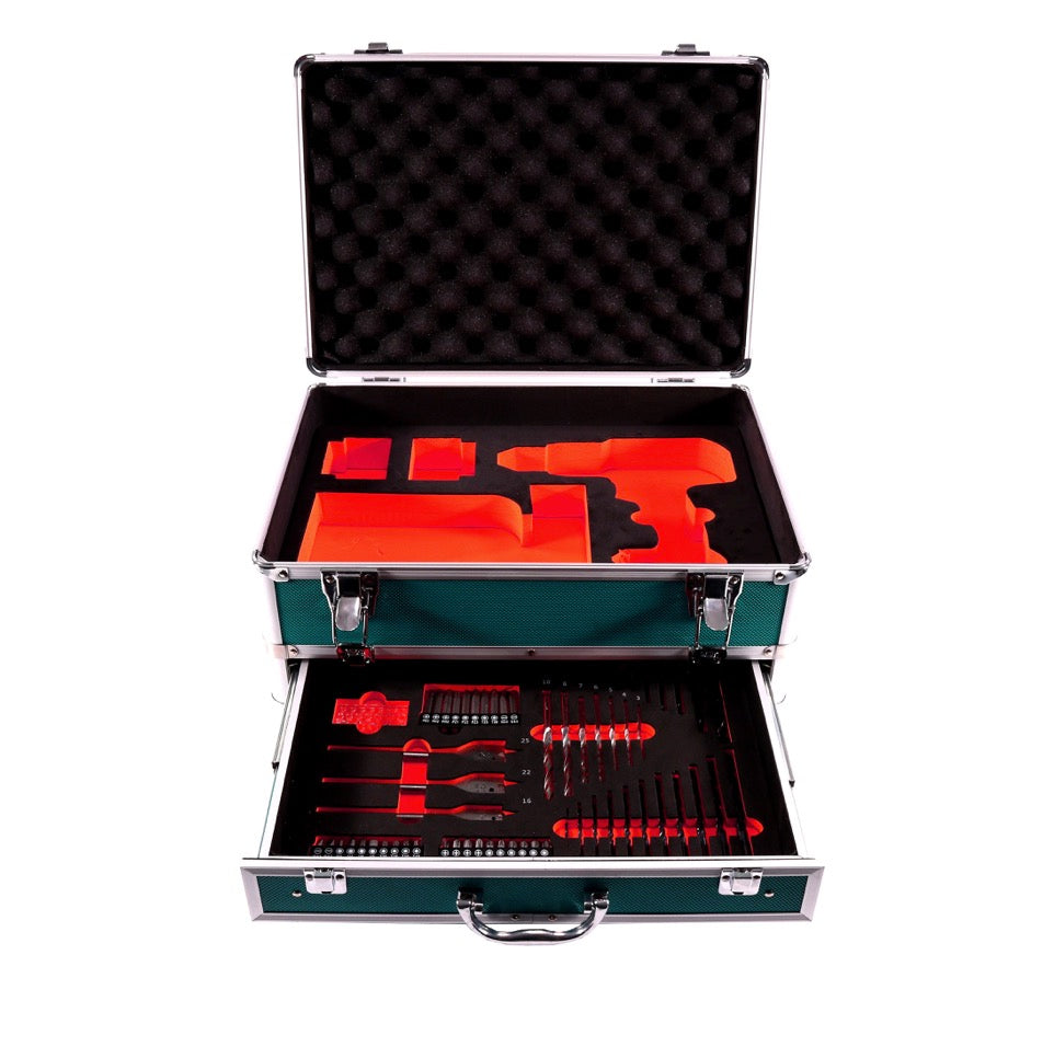 Der Makita DHP 485 Schlagbohrschrauber mit 2-Gang-Vollmetall-Planetengetriebe hat ein abschaltbares Schlagwerk. Der integrierte bürstenlose Motor sorgt für mehr Ausdauer, eine längere Lebensdauer und eine kompaktere Bauweise. Mit leuchtstarker LED. Zudem ist dieser Schlagbohrschrauber durch seine kompakte, kurze Bauform besonders handlich und ermöglicht das Arbeiten an schwer zu erreichenden Stellen. Der DHP 485 hat ganze 21 Drehmomenteinstellungen und damit sehr feinfühlig regulierbar. Der Schlagbohrschrauber ist mit einem Tiefentladeschutz ausgestattet, der das Gerät ausschaltet, sobald der Akku fast leer ist. Makita ist ein führender Elektrowerkzeughersteller und zeichnet sich durch Qualität und Zuverlässigkeit aus. Der Toolbrothers TX Aluminium Werkzeugkoffer bietet ausreichend Platz für eine Maschine ( z.B. einen Schlagbohrschrauber oder Schlagschrauber ), ein Ladegerät und bis zu zwei Akkus. Durch das in der Schublade vorhandene 70 teilige Bit und Bohrer Set sind sämtliche Anwendungen abgedeckt. Es sind Bits, Fräser, Steckschlüssel und Bohrer in vielen Varianten vorhanden. Ob Holz, Metall oder Stein der Koffer beinhaltet eine Vielzahl an Bohrern in den gängigsten Größen. Die gute Verarbeitung des Koffers verspricht eine lange Lebensdauer und ist zudem auch echt schön anzusehen. Der gummierte Tragegriff ist schonend für die Handinnenflächen und kann auch problemlos mit Handschuhen genutzt werden. Die Metallschließen des Koffers sind robust und langlebig. Die Einlagen im Boden und im Deckel gewährleisten einen sicheren Transport der im Koffer befindenden Maschinen. Durch den Aluminium Koffer TX hat man das Arbeitswerkzeug und das entsprechende Zubehör in einem Koffer und sicher gelagert.