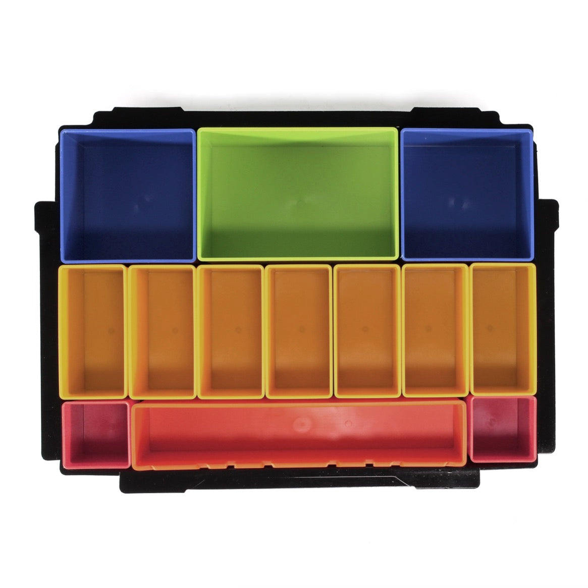 Das Makita MAKPAC-System bietet die beste Voraussetzung, um Ihr Werkzeug und Zubehör stets griffbereit und sicher zu lagern. Die Koffer lassen sich zudem bequem stapeln, festklicken und einfach transportieren. Die Konstruktion des Makita MAKPACs besteht aus doppelwandigen Eckprofilen und verstärkten Deckel-, Seiten- und Bodenflächen. Des Weiteren erhöhen abgerundete Gehäuse- und Griffkanten den Benutzer- und Tragekomfort. Der Boxeneinsatz mit 13 farbigen Behältern passt in jedes Makita Makpac. Es eignet sich ideal für Bits, Schrauben, Muttern und sonstiges kleines Zubehör. Die Boxen können einzeln aus dem Einsatz entnommen und innerhalb des Inlays nach Belieben zusammengesteckt werden.
