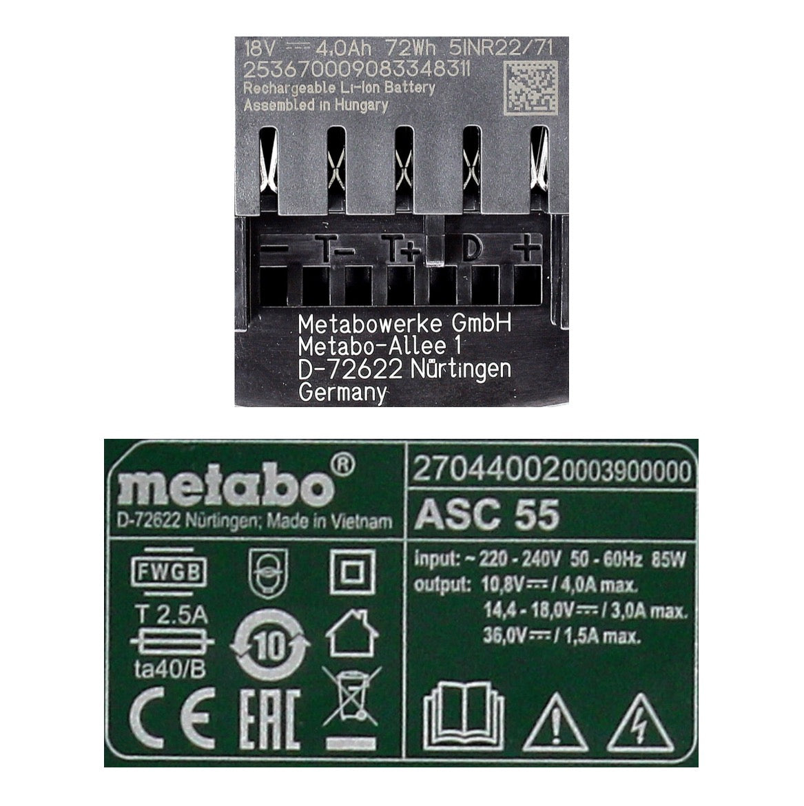 Metabo Akku Basis Set 18V mit 1x Akku LiHD 4,0Ah ( 625367000 ) + Ladegerät ASC 55 ( 627044000 ) Folgemodell vom ASC 30-36