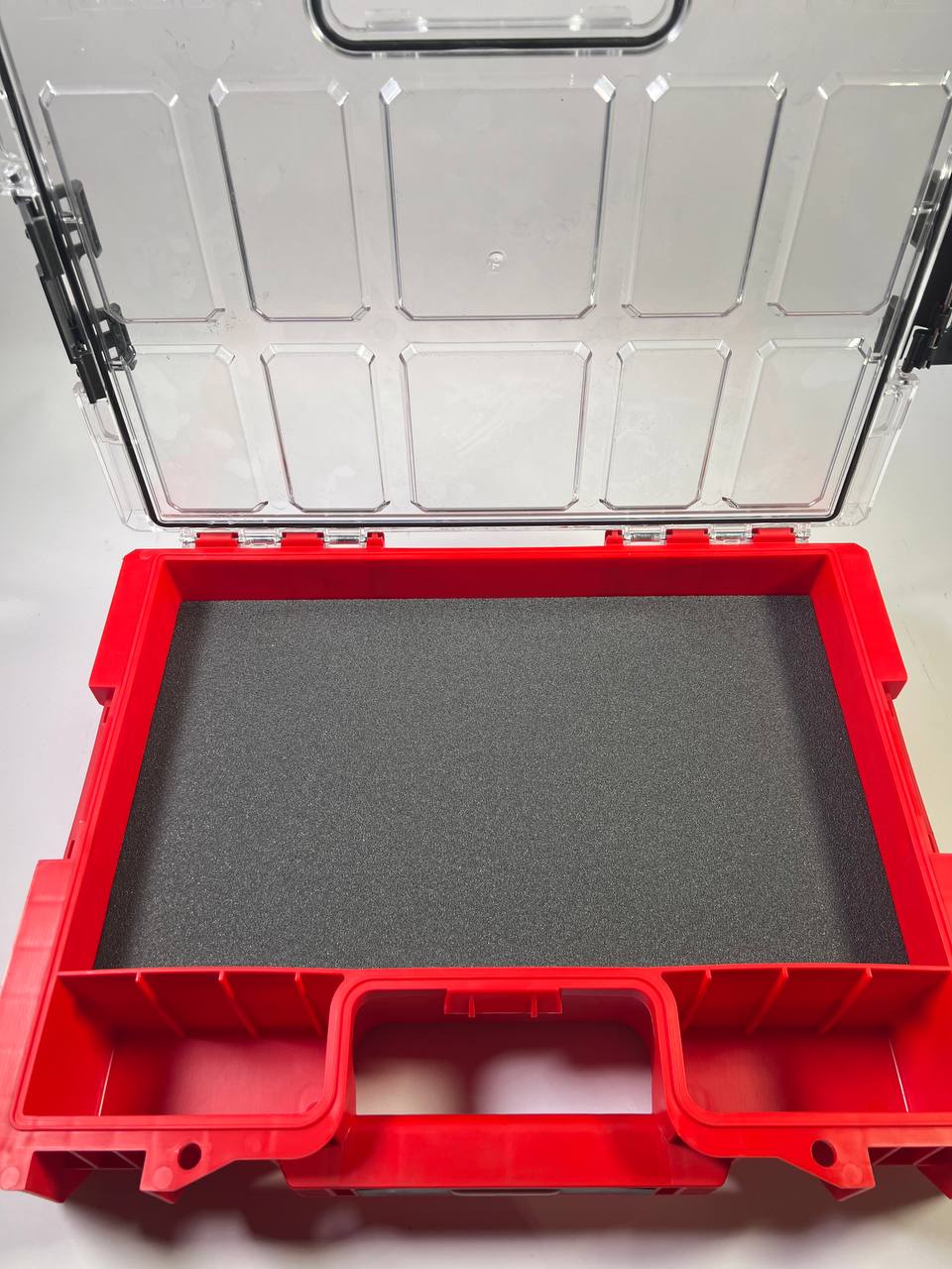 RED ULTRA HD ist eine Sonderedition von Qbrick System PRO-Produkten aus ultrabeständigem Kunststoff, der sich durch außergewöhnliche Beständigkeit gegen mechanische Beschädigungen auszeichnet. Die durchgeführten Schlagtests bestätigen seine außergewöhnliche Haltbarkeit, auch bei Bedingungen unter 0 °C. Qbrick System PRO Organizer 300 ist das größte Organizer-Modell aus der PRO-Linie. Neben den von anderen Modellen bekannten Lösungen, wie dem patentierten Easy Access System, einer Dichtung im Deckel, einem superstabilen Polycarbonat-Deckel, Polyamid-Seitenverbindern und -Frontverschlüssen und einem starken Griff, bietet es einen tieferen Körper, der macht es packbarer. Die MFI-Version ist mit mehrschichtigen Schaumstoffeinlagen ausgestattet, die nach dem Schneiden der entsprechenden Löcher Handwerkzeuge oder Elektrowerkzeuge perfekt schützen.