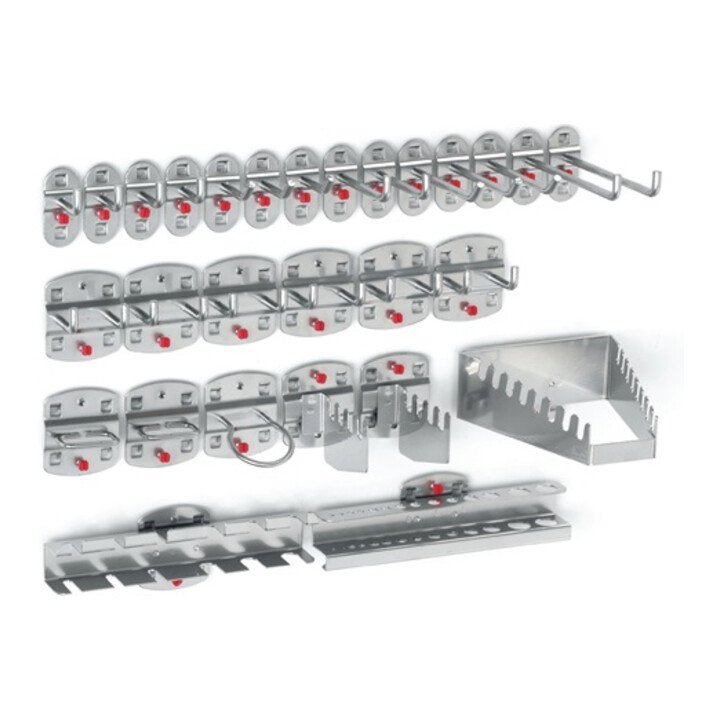 28-teilig Lieferumfang: 6 Werkzeughalter mit schrägem Ende, 8 Werkzeughalter mit senkrechtem Ende, 6 doppelte Werkzeughalter, 2 Zangenhalter, 1 Maschinenhalter, 1 Schraubenschlüsselhalter, 1 Schraubendreherhalter, 1 Bohrerhalter, 2 Sägenhalter