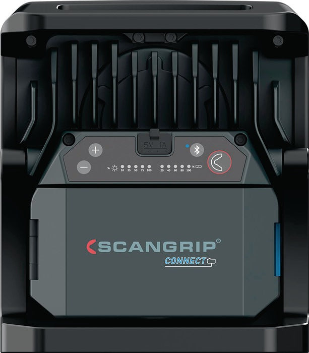hocheffiziente E COB-LED-Arbeitsleuchte mit 4000 Lumen für 18-V-Akkupacks · extrem robuste akkubetriebene Arbeitsleuchte · Dimmfunktion · Anzeige für Akkustand und Lichtleistung · eingebaute Powerbank · Tragegriff und Stellfuß für flexible Ausrichtung und Direktmontage am SCANGRIP-Stativ · Schutzart IP65